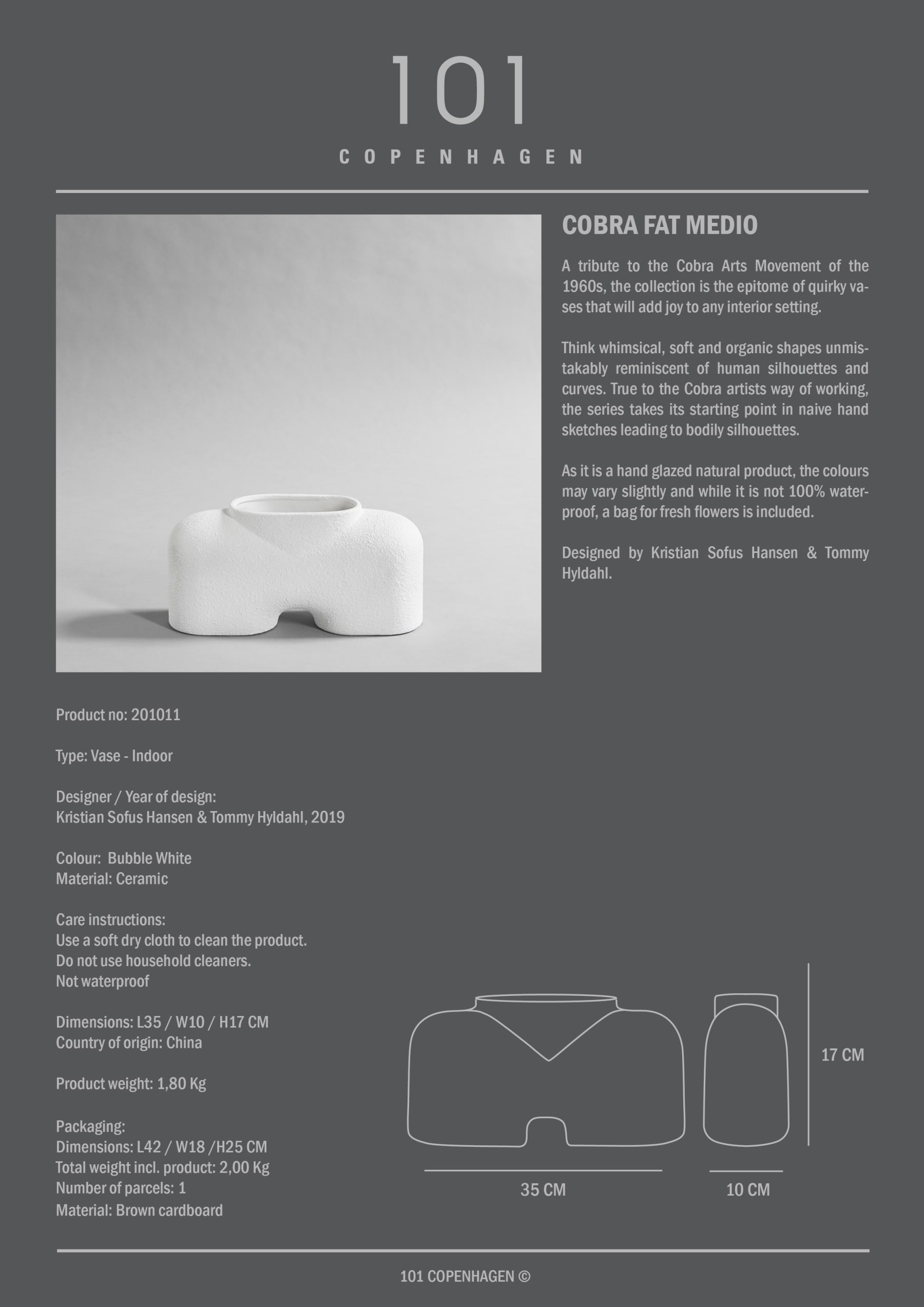 A tribute to the Cobra Arts Movement of the 1960s, the collection is the epitome of quirky vases that will add joy to any interior setting. Think whimsical, soft and organic shapes unmistakably reminiscent of human silhouettes and curves. True to the Cobra artists way of working, the series takes its starting point in naive hand sketches leading to bodily silhouettes. As it is a hand glazed natural product, the colours may vary slightly and while it is not 100% waterproof, a bag for fresh flowers is included. Designed by Kristian Sofus Hansen & Tommy Hyldahl.
