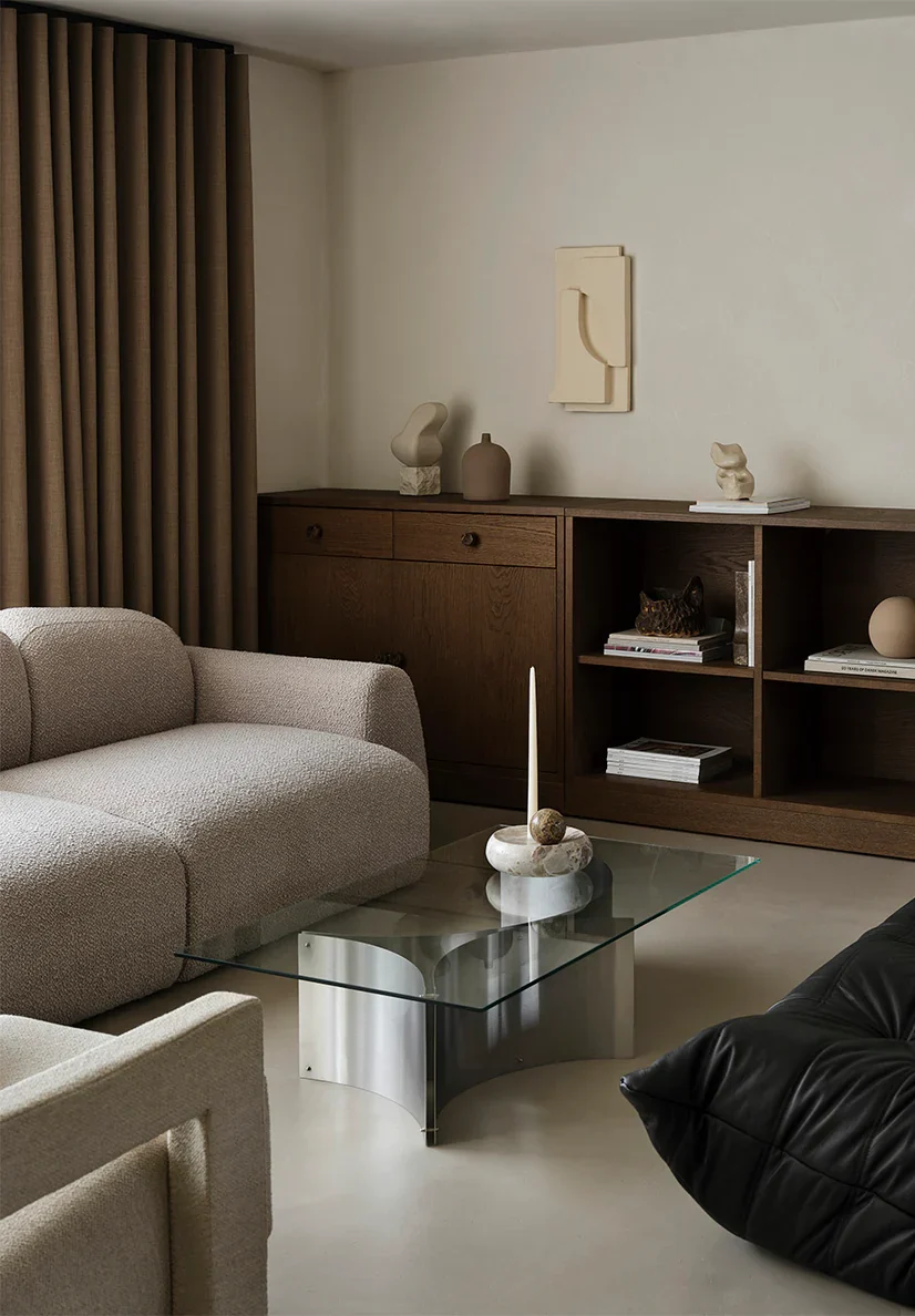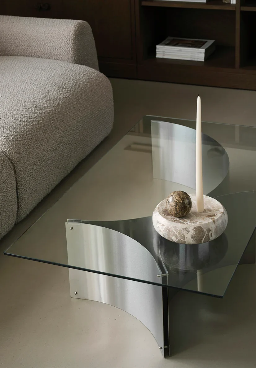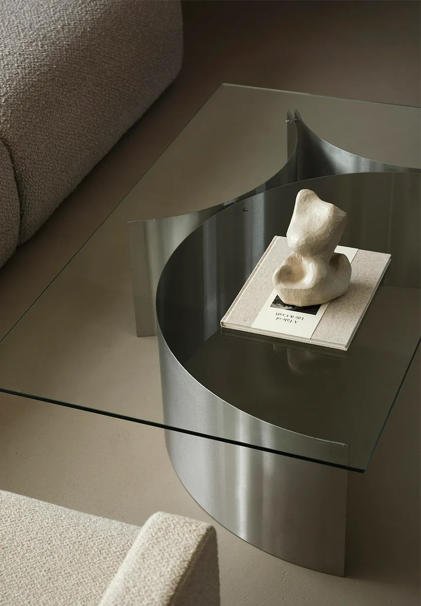 Defined by a sculptural steel base and a transparent glass top, the Curated Coffee Table combines structural clarity with a precise design language. Finished in stainless steel, the curved panels introduce a restrained industrial character, allowing light and shadow to articulate the surface. The exposed bolts emphasise honest construction, while the tempered glass reveals the structure in its entirety. A balanced centrepiece defined by material clarity and structural precision.