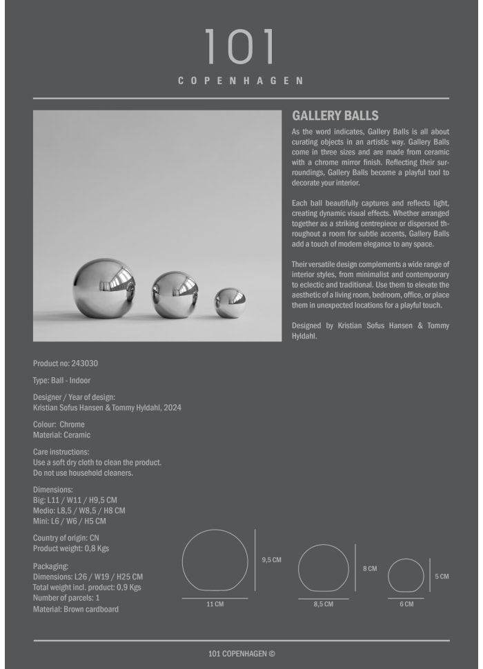 As the word indicates, Gallery Balls is all about curating objects in an artistic way. Gallery Balls come in three sizes and are made from ceramic with a chrome mirror finish. Reflecting their surroundings, Gallery Balls become a playful tool to decorate your interior.