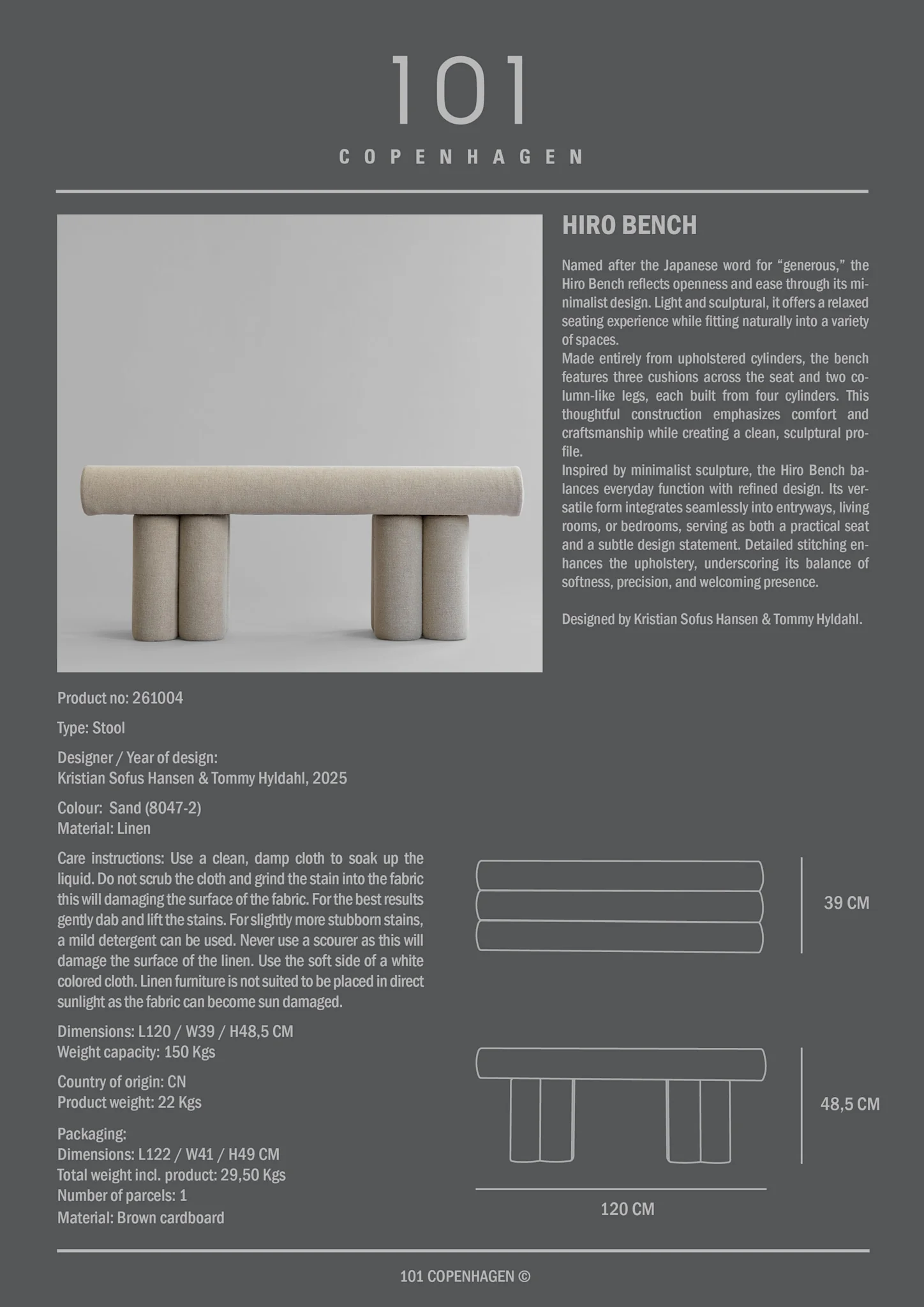 Upholstered in Linen, the bench is finished in a soft, golden-beige tone that carries a sunlit warmth. Reminiscent of coastal dunes and bright shores, the natural fabric adds an airy, effortless neutrality. Subtle variations in tone enhance the tactile surface, while the linen upholstery softens beautifully over time. Placed in an entryway, bedroom, or living space, the Hiro Bench brings quiet elegance, warmth, and timeless craftsmanship to the room.