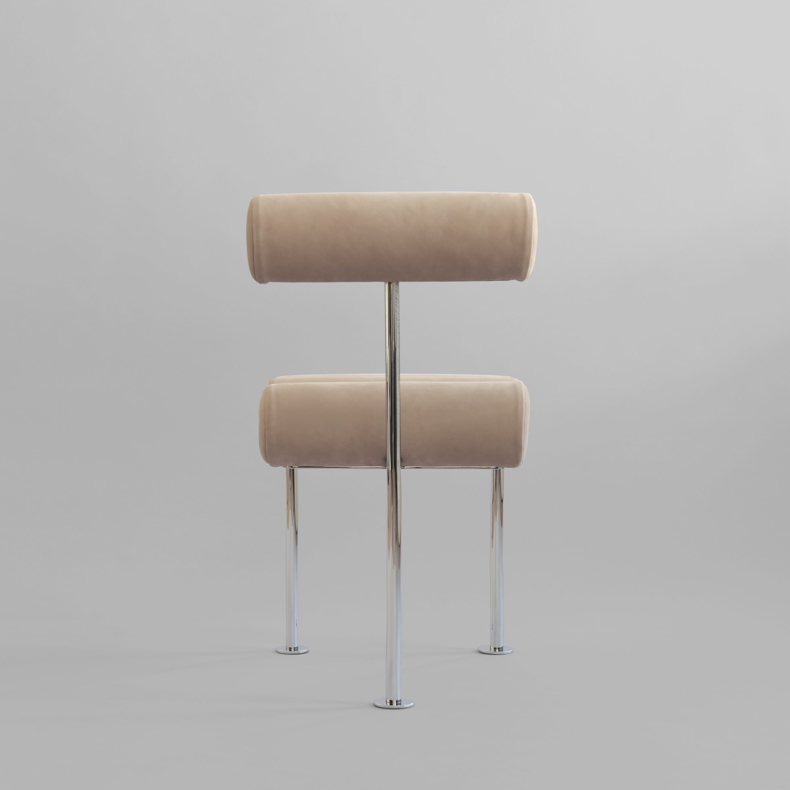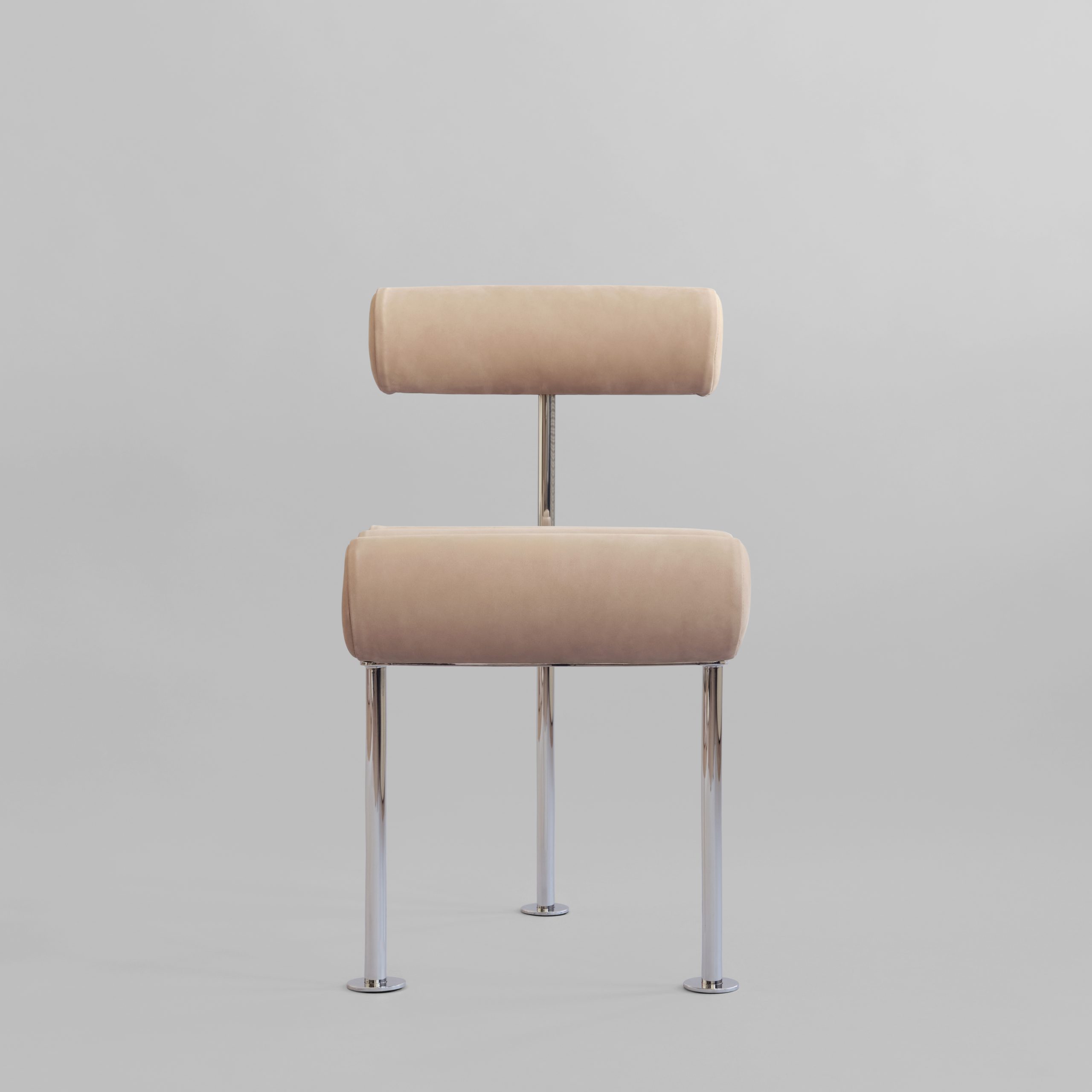 The Hiro Dining Chair is available in two versions: the Hiro Chair pairs a matte black powder-coated steel frame with textured Linen Upholstery for a grounded, architectural aesthetic, or a polished stainless steel frame with smooth Italian Nubuck Leather for a lighter, more ethereal effect that makes the seat appear to float in the air. Both variations are thoughtfully composed to highlight the chair’s clean silhouette and ba- lanced proportions.