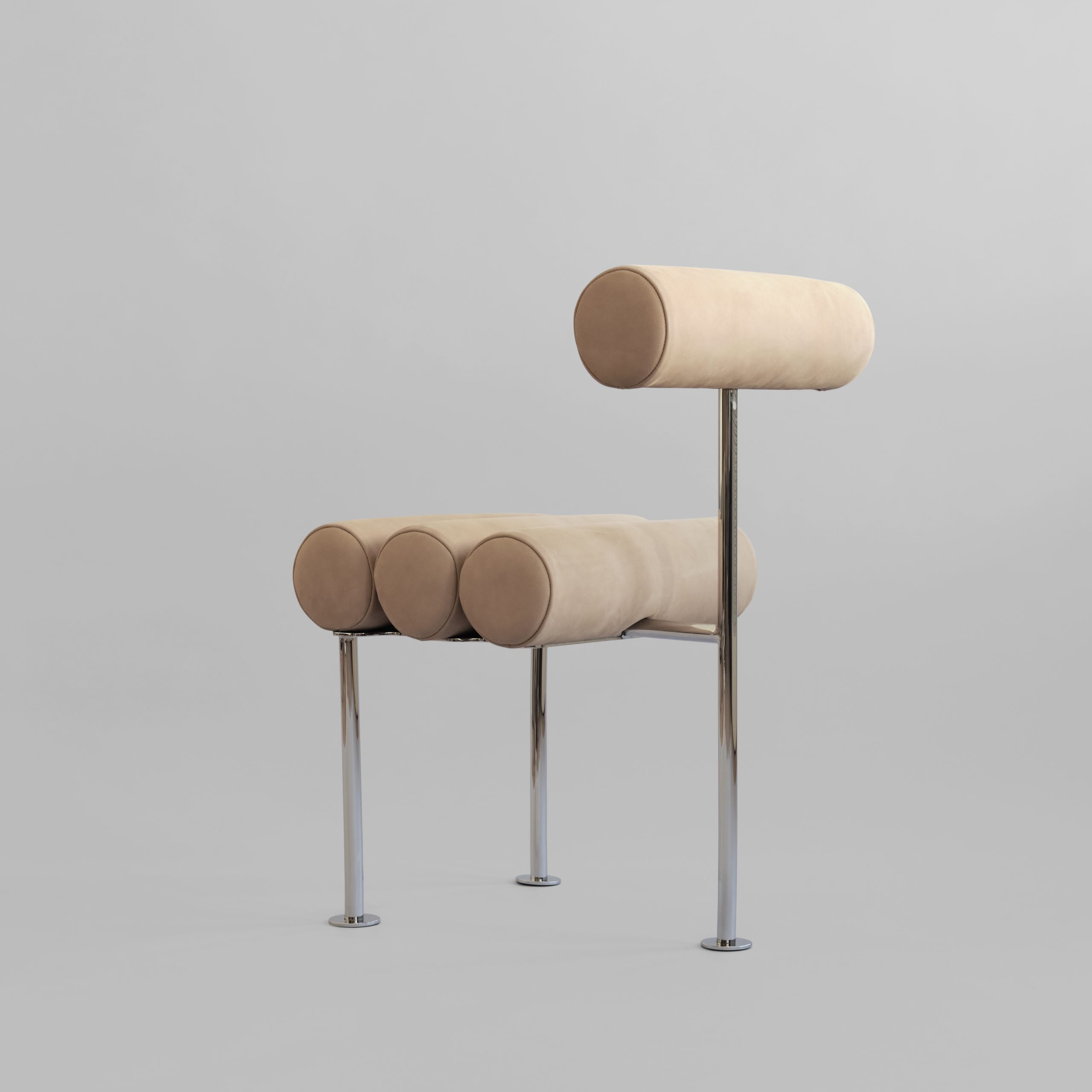Named after the Japanese word for “generous,” Hiro embo- dies a sense of openness and ease. Its light, minimalistic construction features a simple steel frame supporting two cylindrical backrest doubles as a practical handle – allowing for effortless movement and versatility throughout the home. Blending functionality and form, Hiro chair draws its in- spiration from minimalist sculpture, transforming the chair from a merely object to a sculptural piece to place at a dining table or used as a sculptural accent in a bedroom or hallway. Hiro adapts seamlessly to its surroundings.