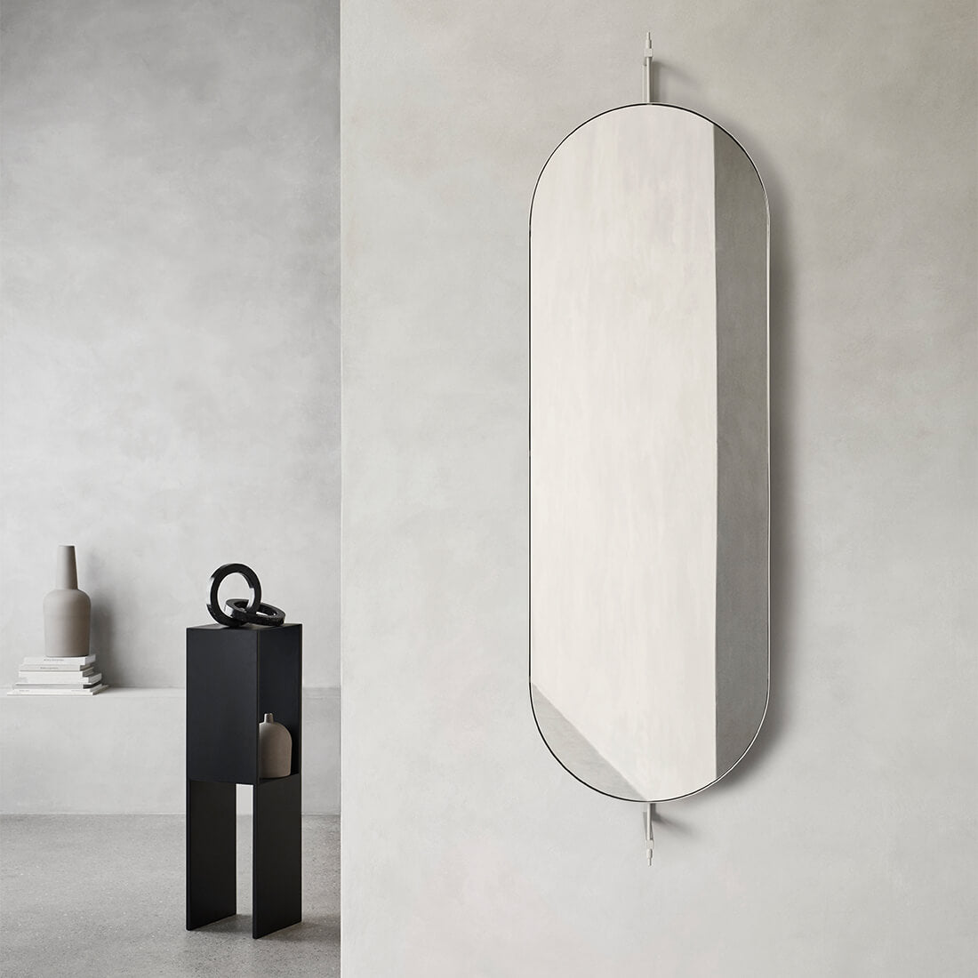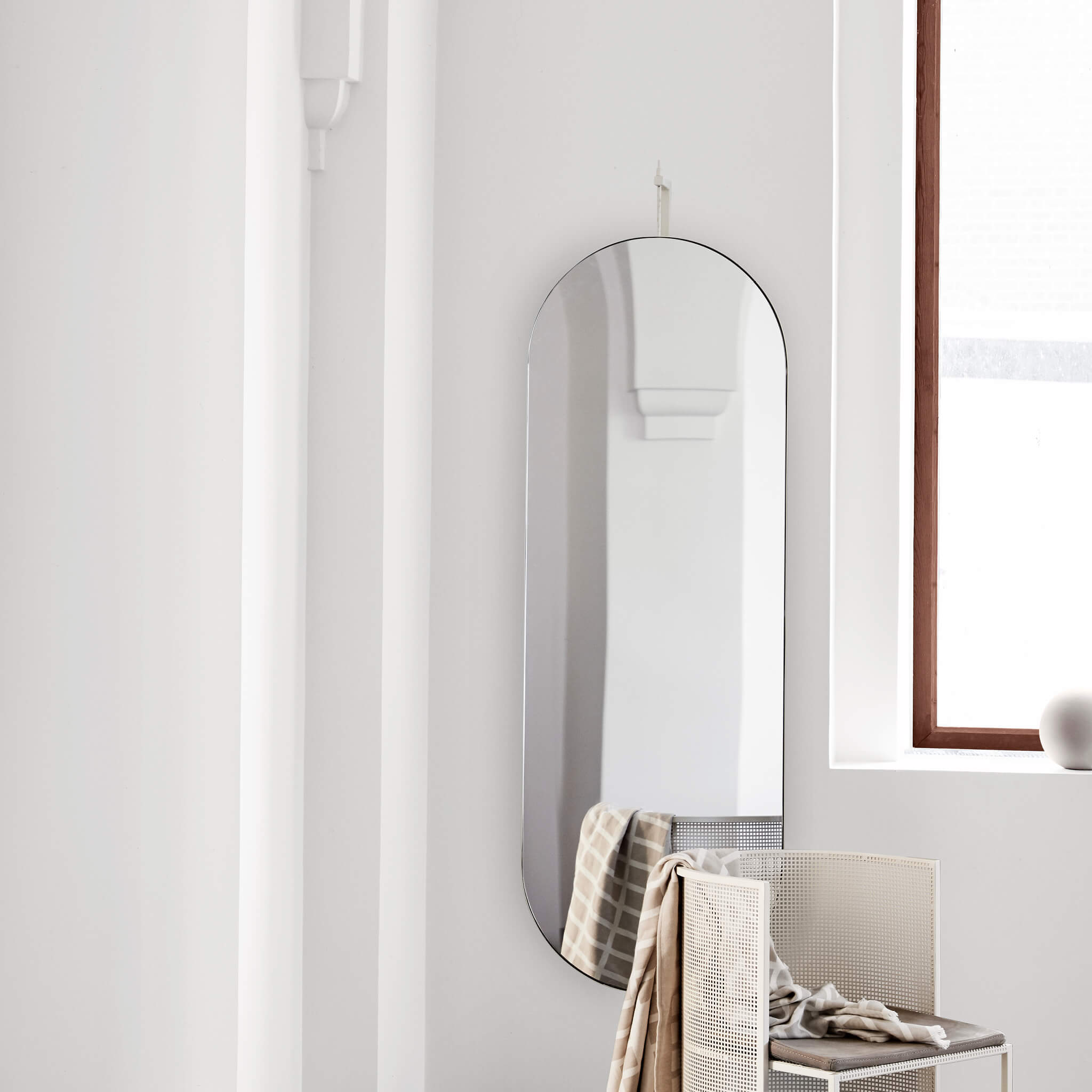 Less is more. Thus, the simplicity of the rotating, wall mounted mirror is apparent. It is designed with a clear reference to the proud heritage of Nordic design. Rotating Full Size Mirror is a gentle, artistic interpretation of the classic mirror. Behind the mirror is a hook placed where you can hang your clothes. Use the mirror in your living room, hallway, or as a bathroom mirror.