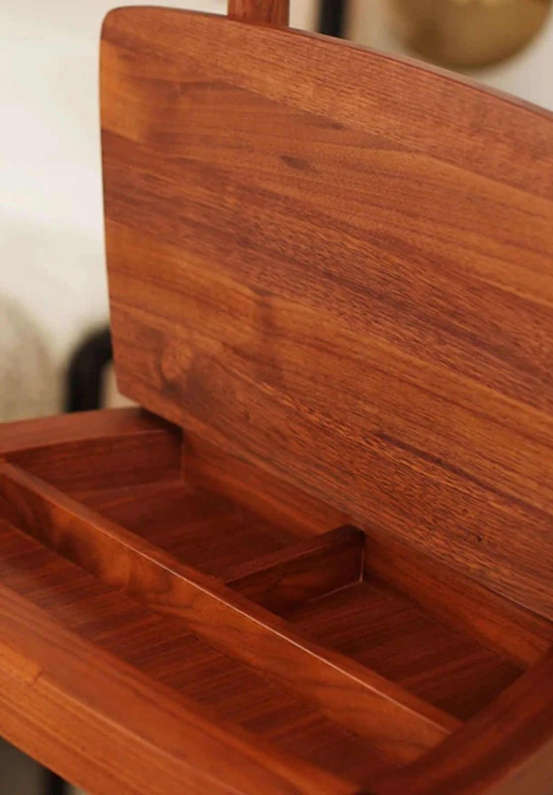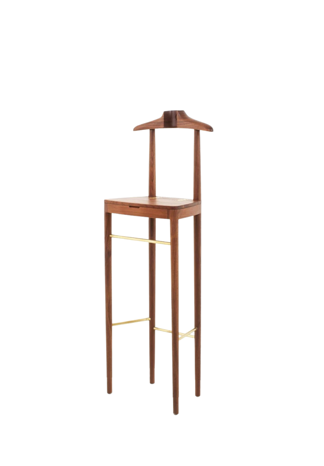 Laval Gentleman’s valet stand is made of solid walnut with details in brass-plated stainless steel, it has a clean and elegant line that combines style and functionality. Incorporating a shaped coat hanger for jackets, a rod for trousers and a retractable container for accessories, the valet stand is perfect in the bedroom or dressing room, to keep everything you need in perfect order.