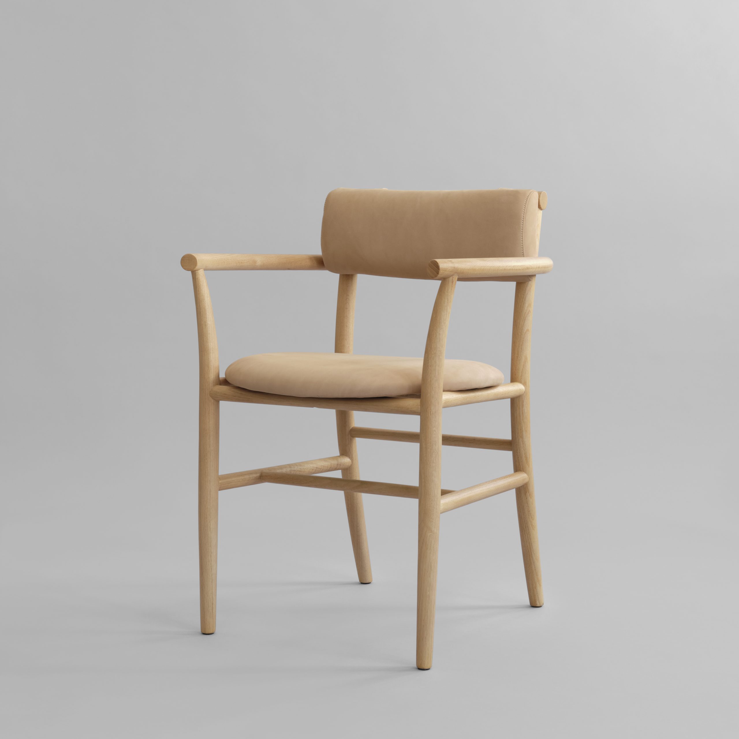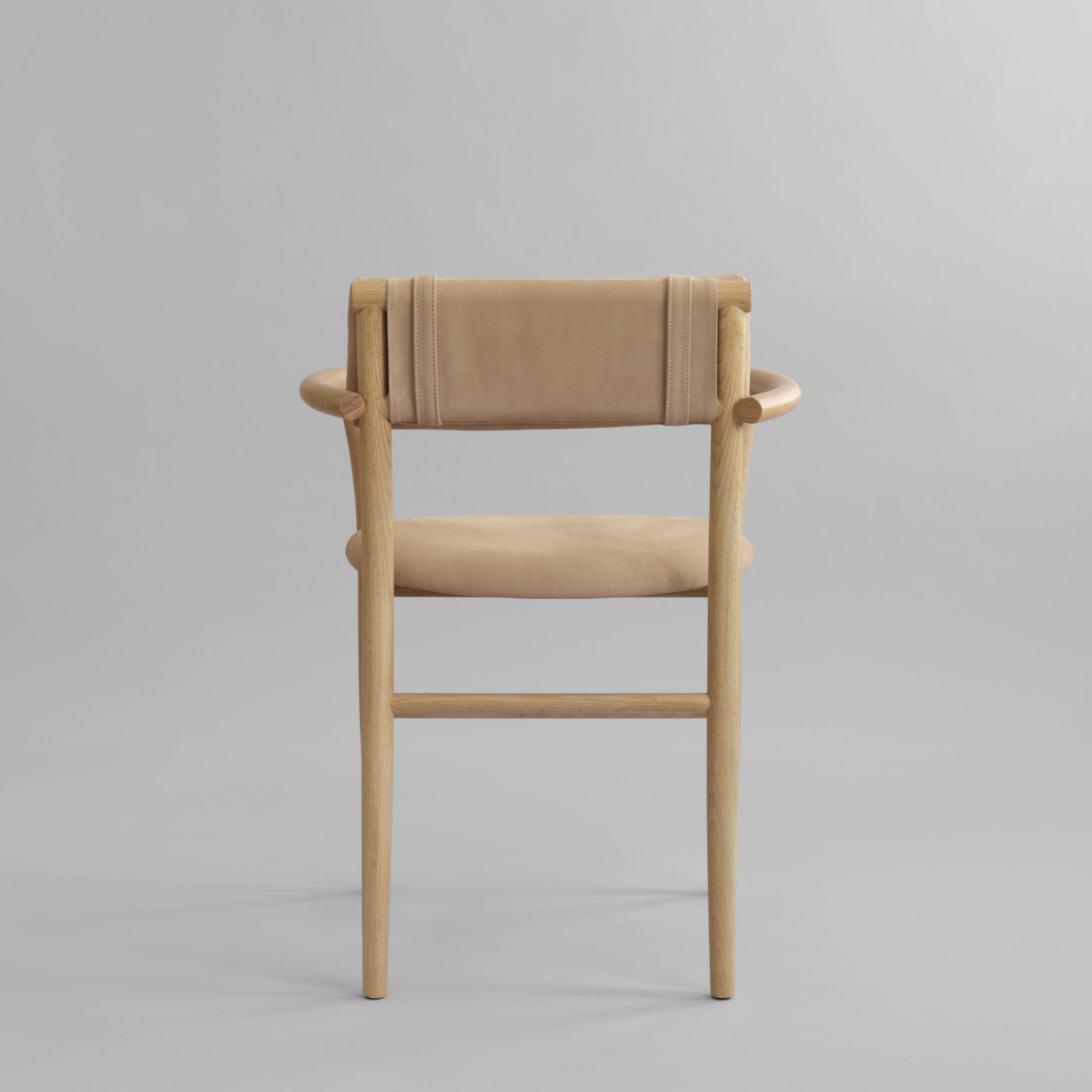 A lightweight, elegant dining chair, the chair is available with or without armrests, making it versatile for both private and commercial spaces. Each version, upholstered or not, is in- spired by Copenhagen bicycle bags and secured with simple straps, adds comfort and visual appeal, complemented by a soft, tactile and well-cushioned seat. It comes in three ver- sions – Natural Oak with Nubuck Leather, Oak Coffee Black with Black Aniline Leather and Oak Coffee Black with Linen – ensuring the chair balances organic warmth, bold con- trast, and soft elegance.