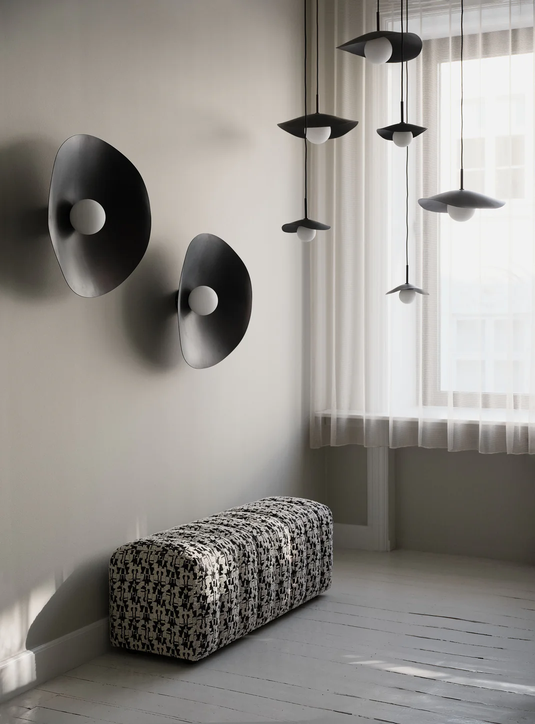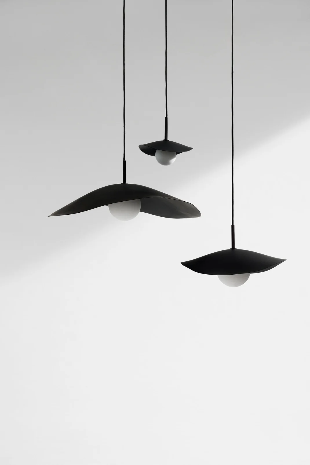 The design of the Fuji lampshade is inspired by Japan’s Mount Fuji. The lampshade is made of aluminium with a light bulb made of opal glass. Soft and decorative lighting. Different cone shapes based on the angle; when looking at the lamp linear or from aside. Opal glass gives a warm light with an organic aluminium profile. Can be combined with many pendants into an installation.The lampshade is made of aluminium and opal glass. Socket: E14. Cord length: 380 cm. Cord colour: Black. Watt: LED 5-8W. Plug: Not Included. Ceiling Cup: Included | Designer: Kristian Sofus Hansen and Tommy Hyldahl | Material: Aluminium.