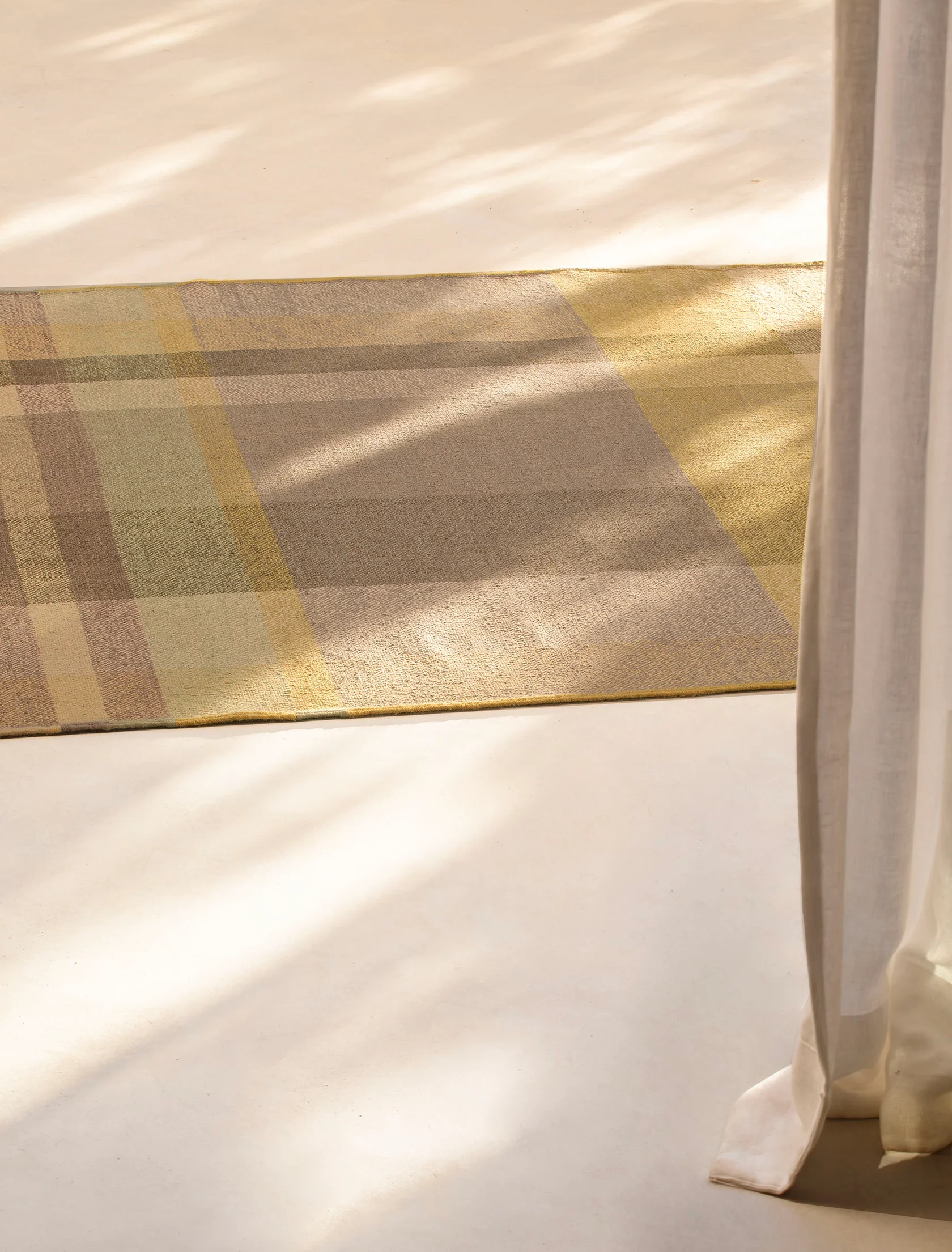 This collection presents a unique visual proposal, where a pattern of parallel and intersecting lines appears and disappears within the same color scale. The result is a monochromatic design, yet with a depth and texture that evoke a contemporary tartan. Through the subtle interaction between colors and fiber structure, the collection achieves a dynamic graphic effect that changes depending on the light and perspective.