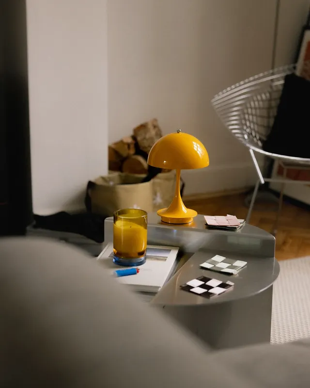 The Panthella 160 Portable lamp is a downscaled version of the original design. The lamp is only 160 mm in diameter, making it the perfect size to take from room to room or outside on the balcony or in the garden, where it will look amazing and create a wonderful ambience.