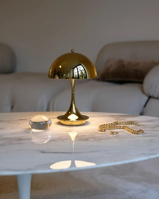 The Panthella 160 Portable lamp is a downscaled version of the original design. The lamp is only 160 mm in diameter, making it the perfect size to take from room to room or outside on the balcony or in the garden, where it will look amazing and create a wonderful ambience.