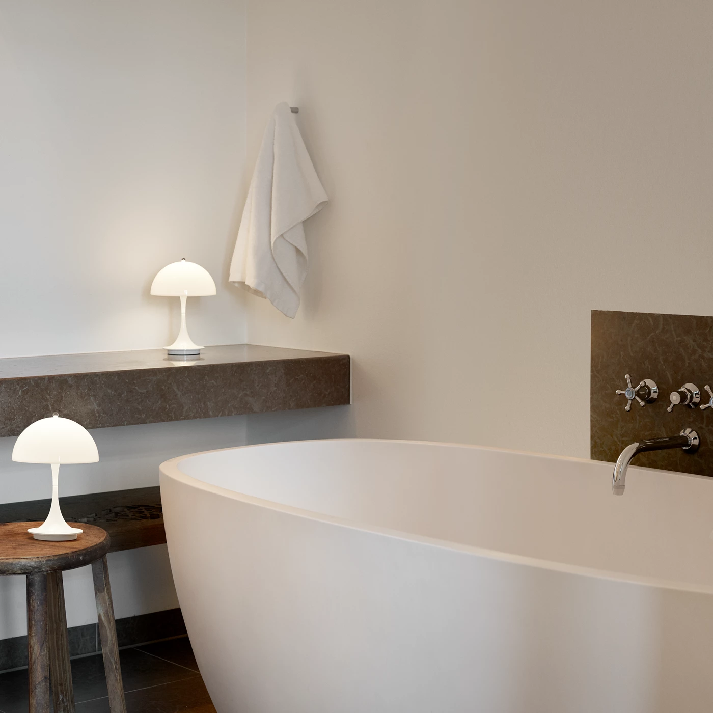 The Panthella 160 Portable lamp is a downscaled version of the original design. The lamp is only 160 mm in diameter, making it the perfect size to take from room to room or outside on the balcony or in the garden, where it will look amazing and create a wonderful ambience.
