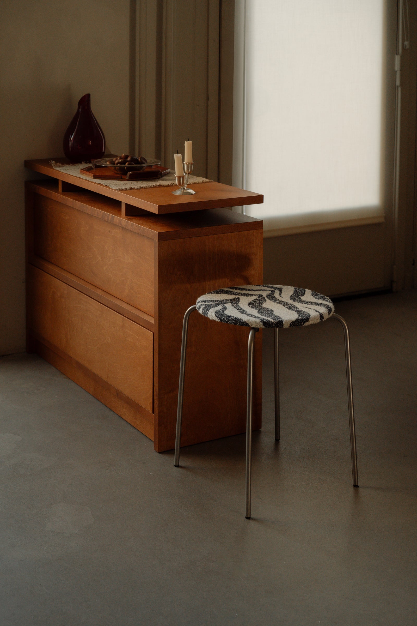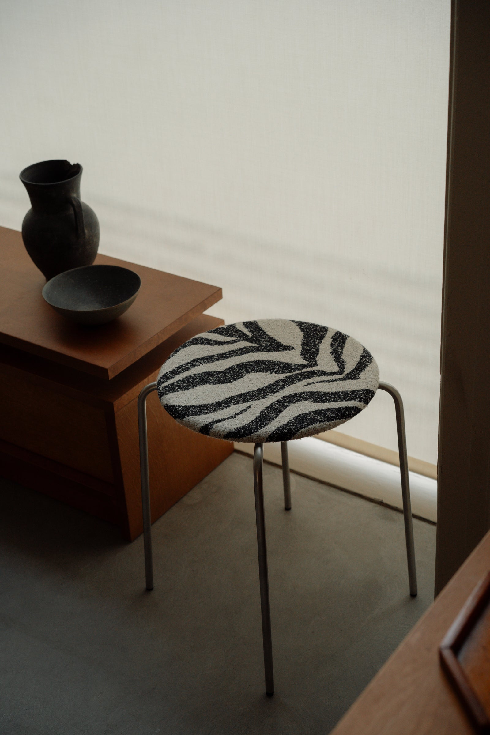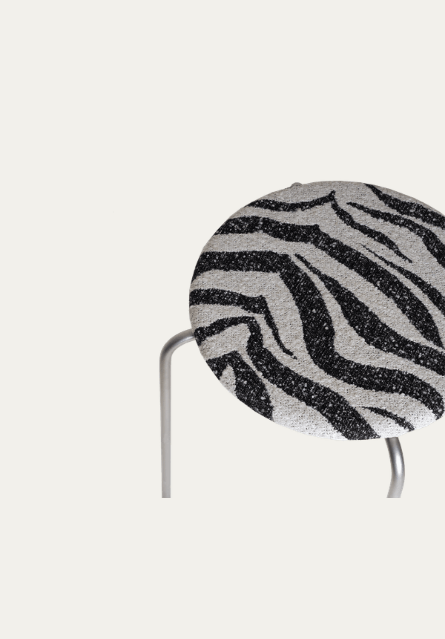 Designed from an architectural point of view, the slim profile of the Petit Rond Stool contains immense thought: into its comfort, its durability, and its character. True to its name—“small circle” in French—the Petit Rond Stool is composed of straightforward shapes. Lightweight, and finishes with a zebra fabric to add a textural finish to the simple design.