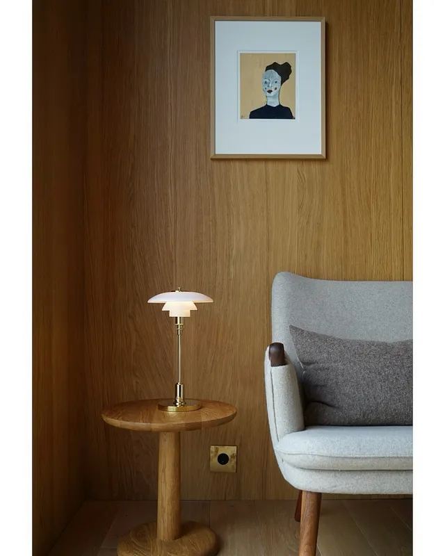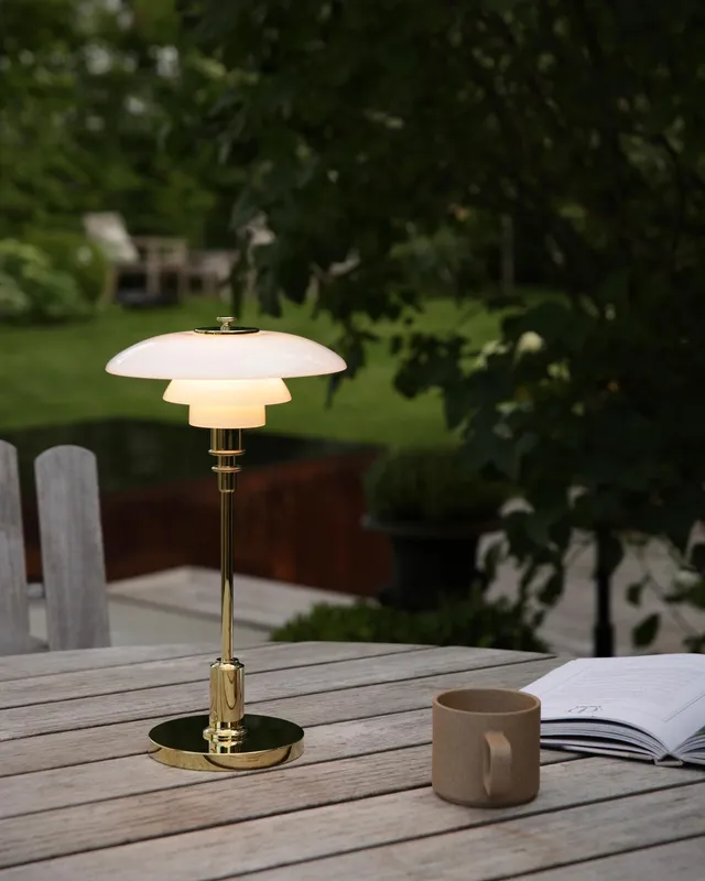 The PH 2/1 Portable is a cordless version of the classic petite table lamp, which with its mouth-blown opal glass-shades and stem and base made of either high-lustre chrome or metallised brass.