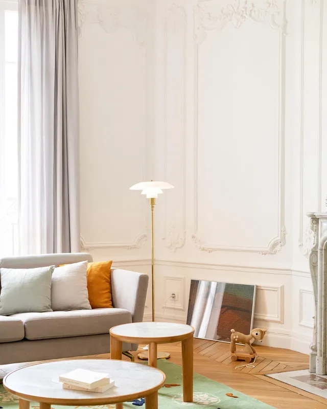 Poul Henningsen designed the three-shade system back in 1925-1926. The first lights using the system were designed by PH in cooperation with Louis Poulsen for an exhibition in Paris. This partnership continued up until his death in 1967. Throughout his life, PH sought to create glare-free light, direct light where it was most needed, and create soft shadows, using incandescent bulbs as a light source. The 3½-2½ Floor light is a member of the three-shade family which numbers 30 lights today, including three for outdoor use. Thus PH did not just design a light, but an entire system – around a thousand different models have been produced over the years. This wide selection consisted of table, floor and wall lamps, as well as a number of different chandeliers, which were very popular in the 30s for lighting private homes from high ceilings. There were countless combination options. The lights were available in different colours, as well as a range of sizes. The first shades were made of metal with a painted undersurface, such as white, gold or silver – depending on whether diffuse, warm or cold light was desired. Glass was later introduced for the three-shade system. In addition to the downward-directed light, glass lamps illuminated the room. PH was the first person to pursue a scientific approach to light and use the logarithmic spiral as a basis. By using a design based on the logarithmic spiral he achieved even distribution of light over the entire curve of the shade. This even light distribution, together with the diffuse reflection through the glass, made it possible to control glare and shadow. Each shade reduces the amount of light equally, due to their distance from the light source. The PH light model numbers refer to the shade size. Each top shade had a corresponding set of middle and lower shades. In the ‘pure’ models, such as the 2/2, the top shade has a size of about 20 cm, with corresponding lower shades. PH 3½-2½ Floor consists of an approximately 35 cm top shade with lower shades. These ‘hybrid’ models were introduced due to the desire to hang pendants at lower heights. The system was also used for floor, table and wall lamps. PH 3½-2½ Floor in its current form was introduced in 2002.