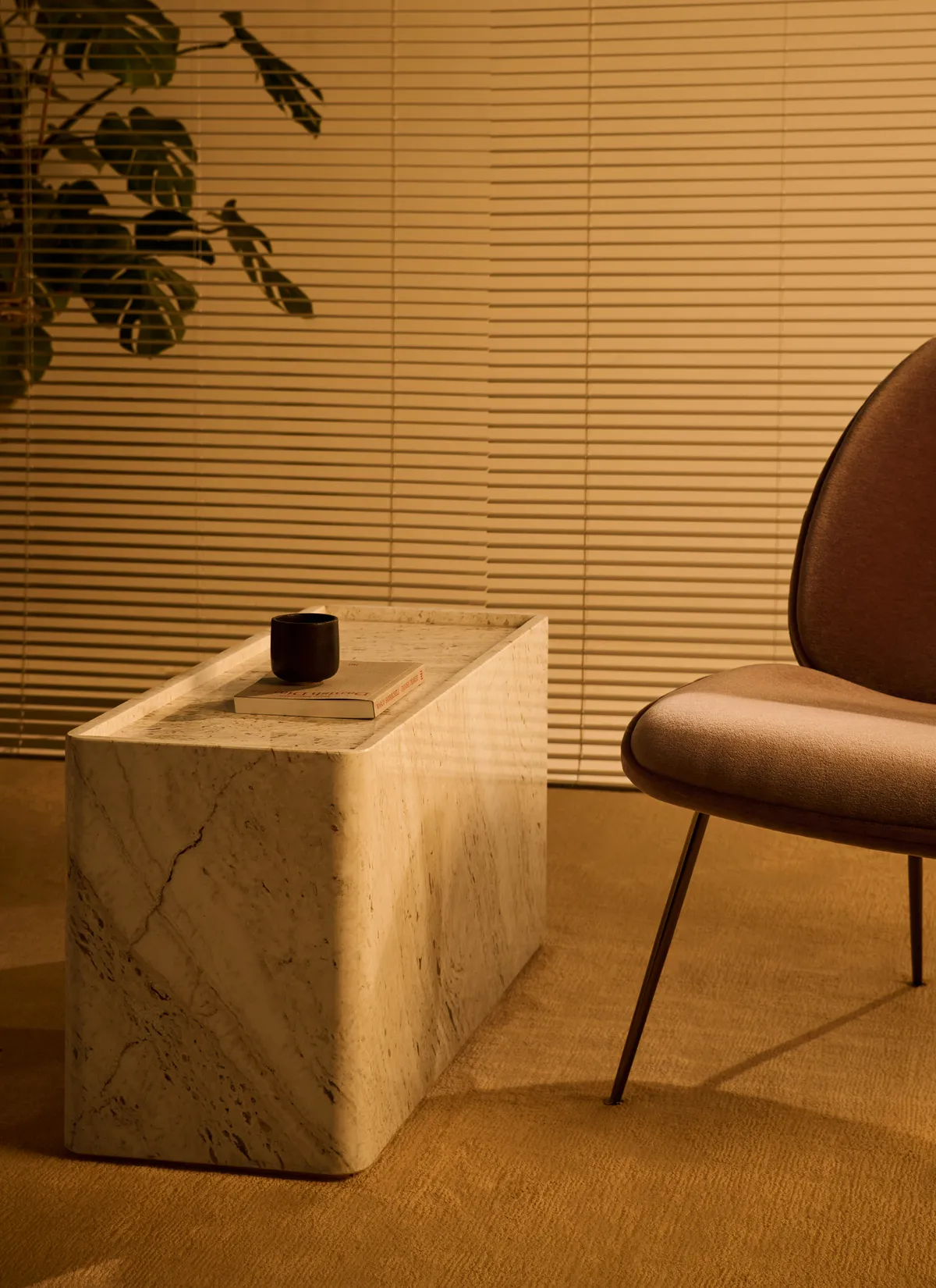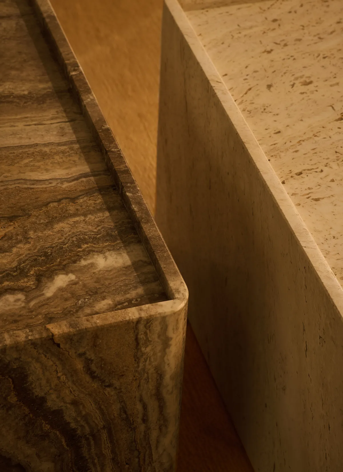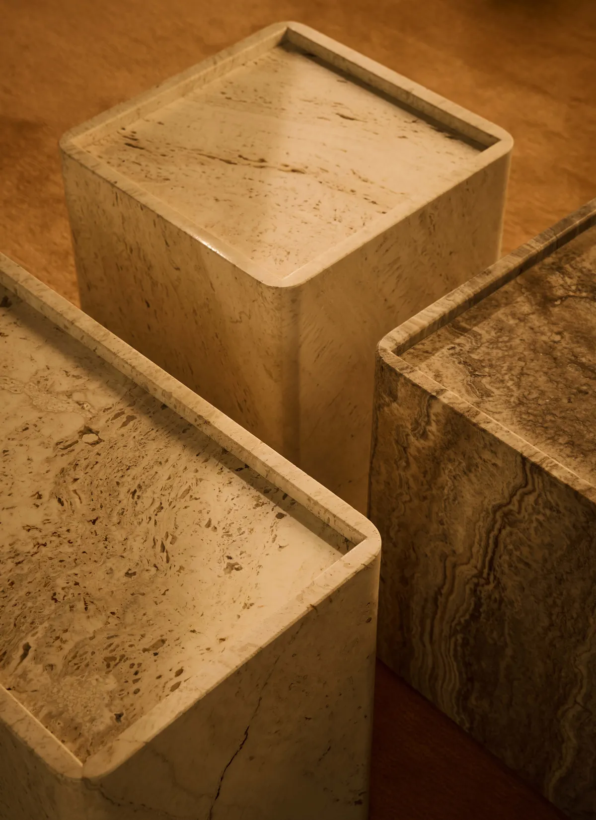 Continuing GamFratesi’s material exploration of travertine that began with the Epic and Doric Tables, the Pietra Side Tables celebrate the mesmerizing patterns found in the surface of the stone. Available in two sizes and two colors, the tables are deceptively lightweight, each constructed by hand from six pieces but resembling solid blocks. A raised lip around the gently curving edge of the tabletop creates a useful tray-like surface, ideal for displaying objects or placing a glass securely. Carefully cut, fitted, and finished, the curved edges and corners exemplify the extraordinary level of craftsmanship behind the table, and imbue the stone with a sense of softness.