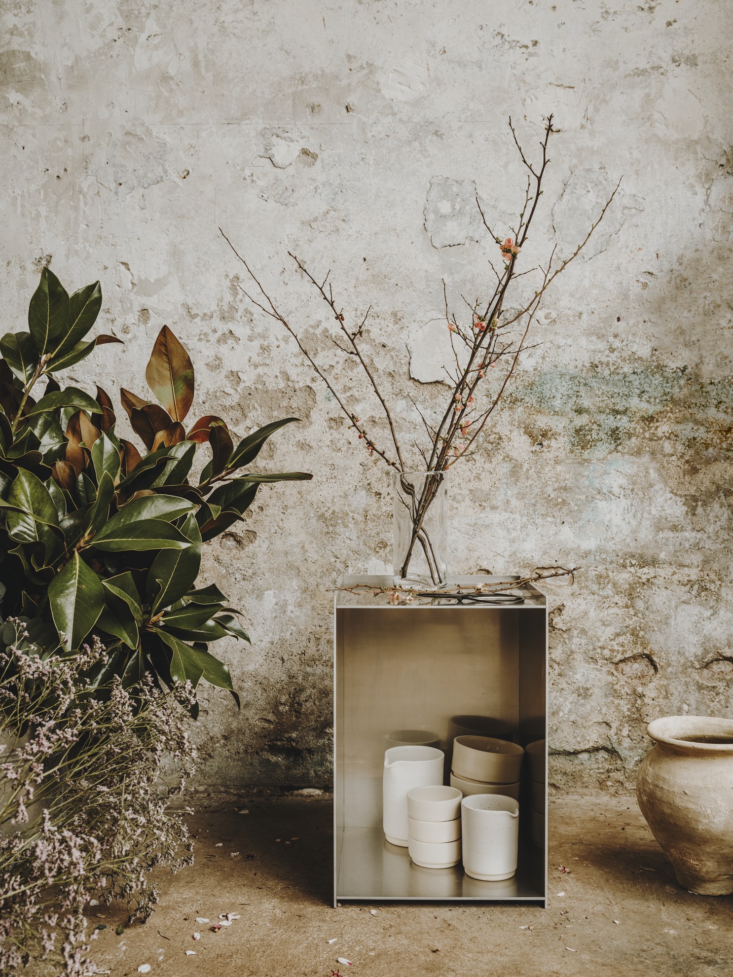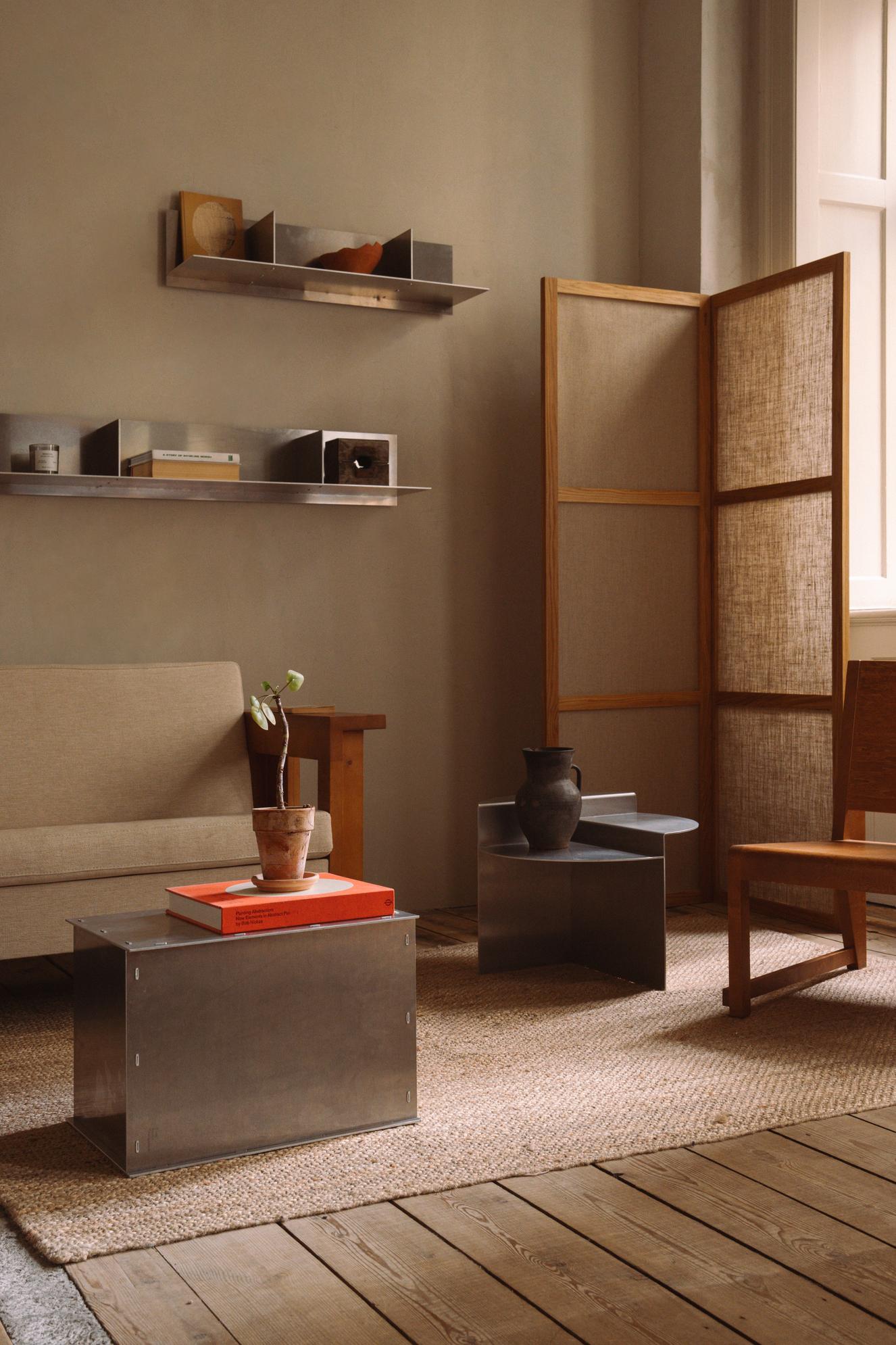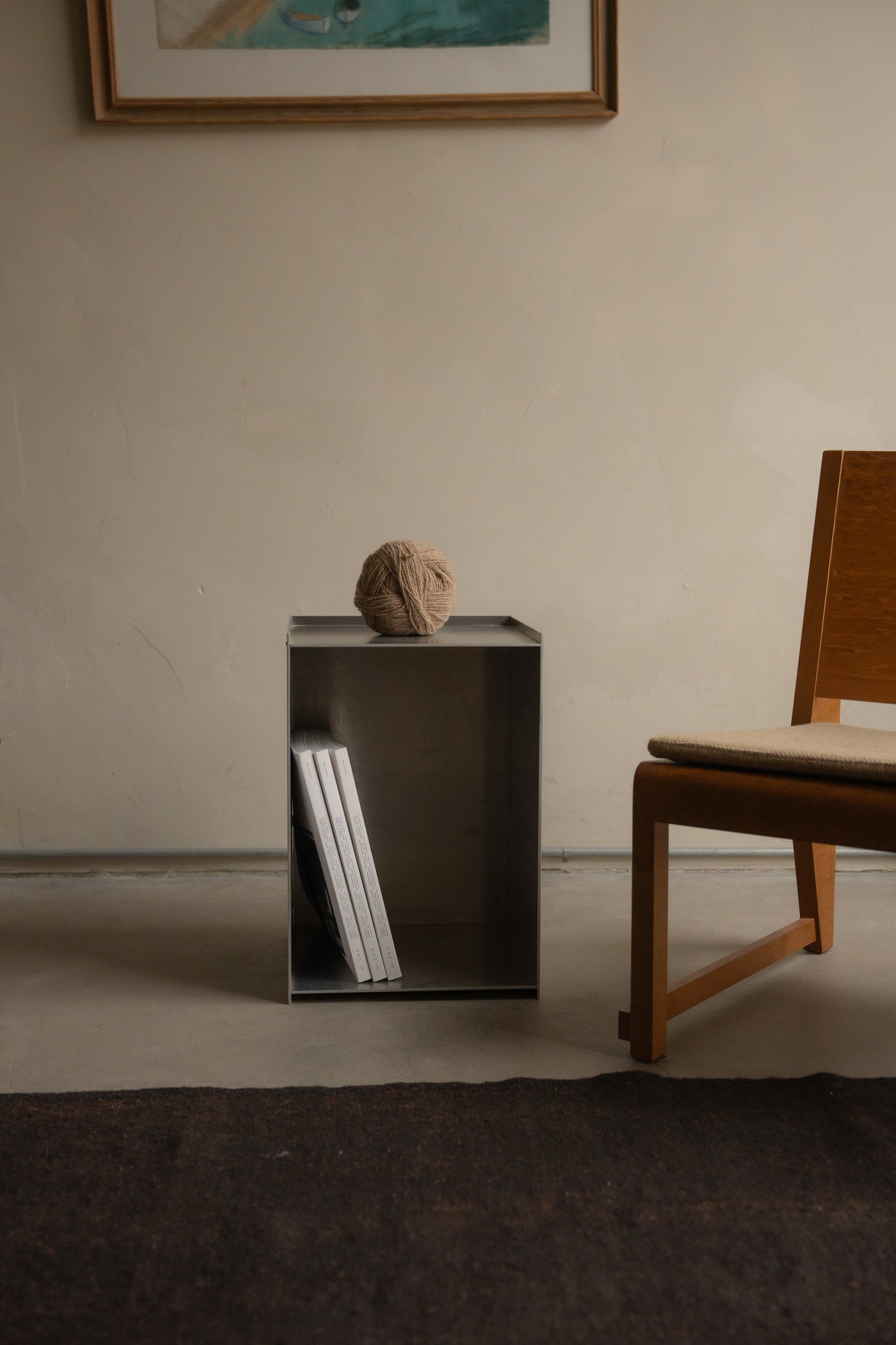 The Rivet Box Table is a sturdy, timeless piece of furniture that can be arranged vertically or horizontally and can be used as a table, a storage unit, a pedestal for display, or a combination of all three. Based on a riveting technique suitable for making perpendicular joints between separate, laser-cut raw aluminum sheets, the item is put together by hand using a hammer in a cold-forming assembly process developed by designer Jonas Trampedach in 2011.