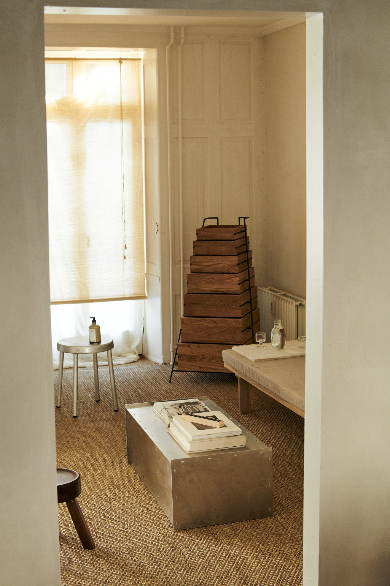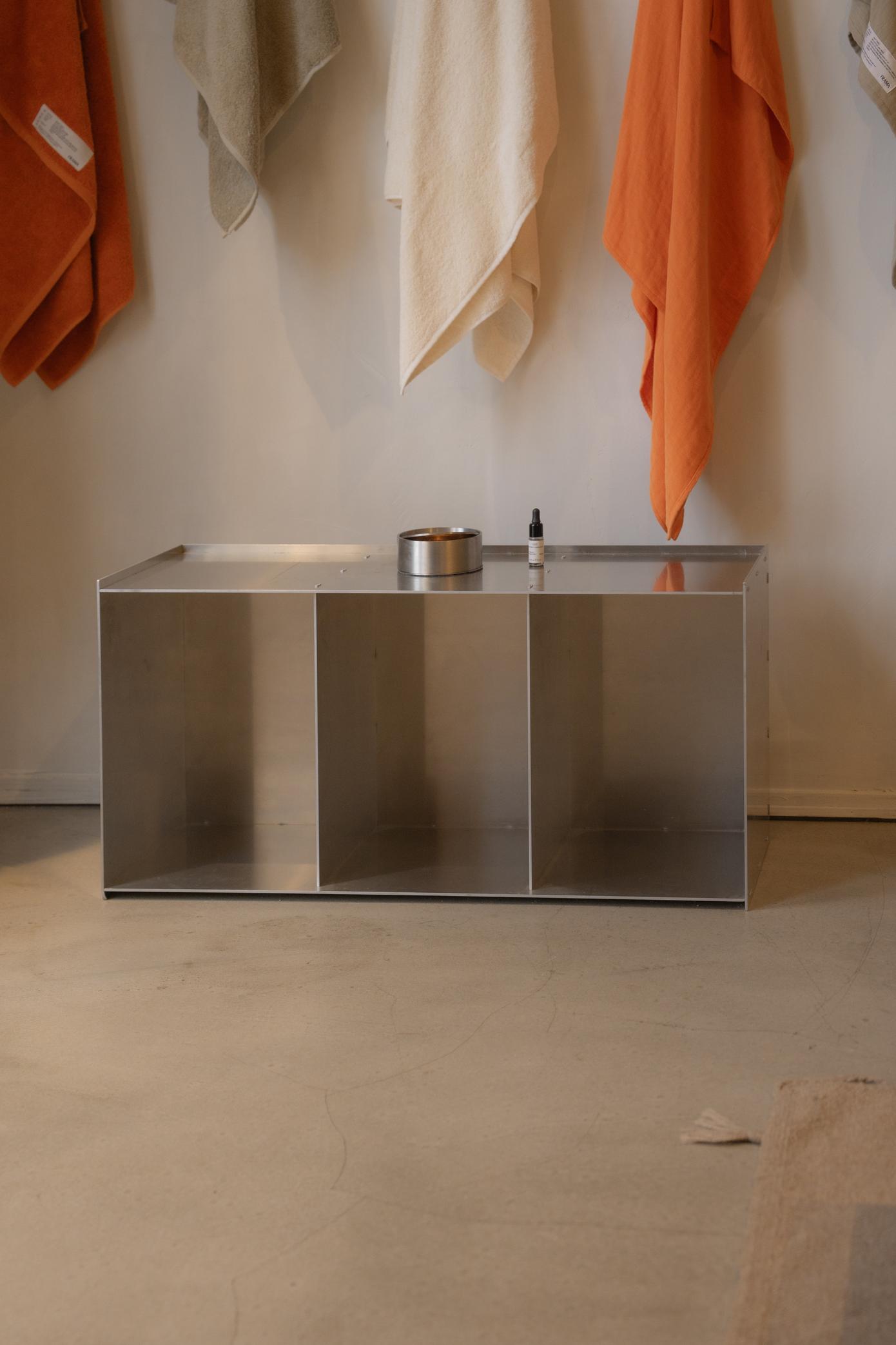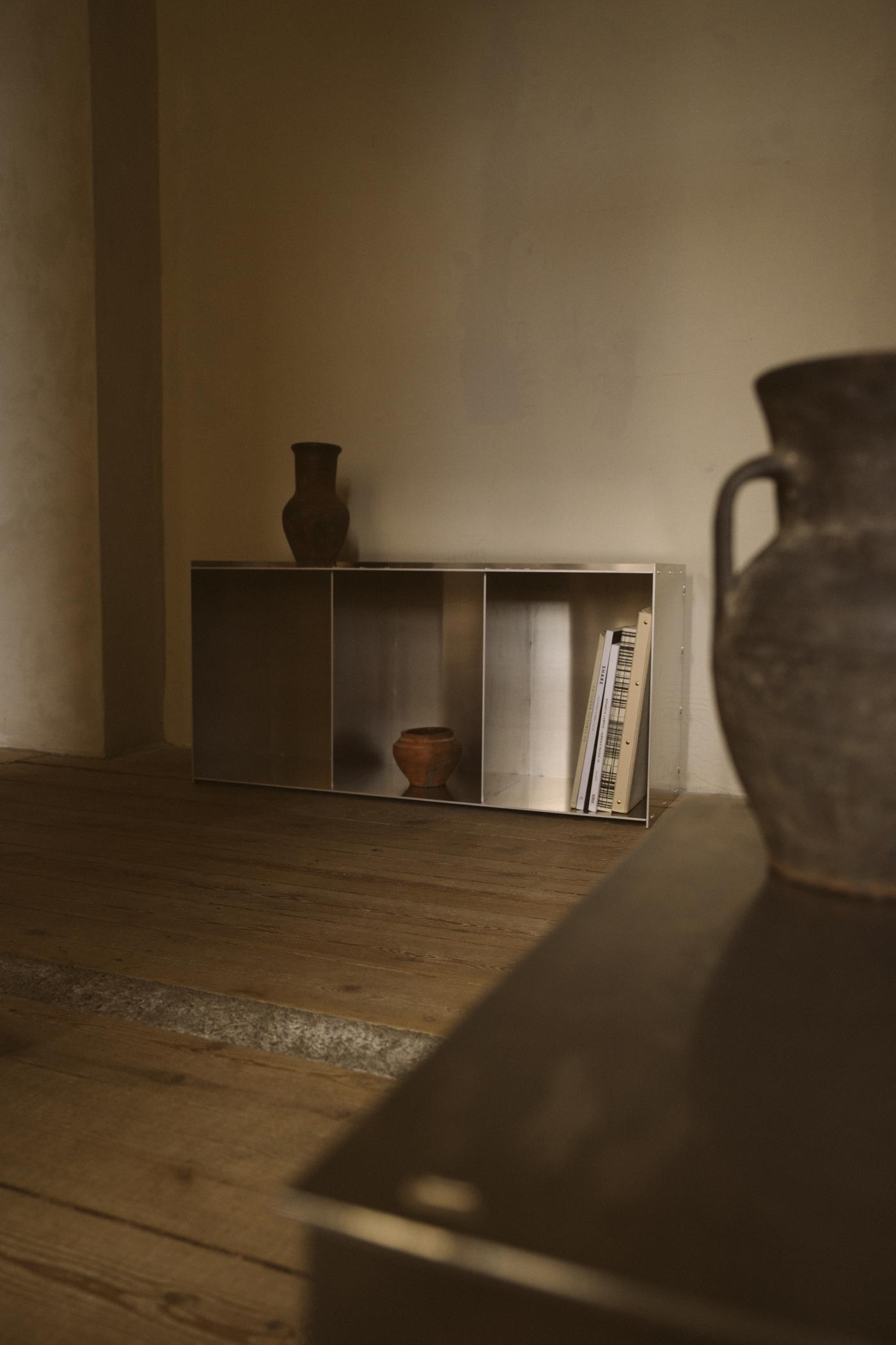 The Rivet Case convinces with its solid and versatile design. It can be placed vertically as well as horizontally while functioning as a table, storage, or display room. Based on a riveting technique suitable for making perpendicular joints between separate, laser-cut raw aluminum sheets, the case is put together by hand using a hammer in a cold-forming assembly process developed by designer Jonas Trampedach in 2011.