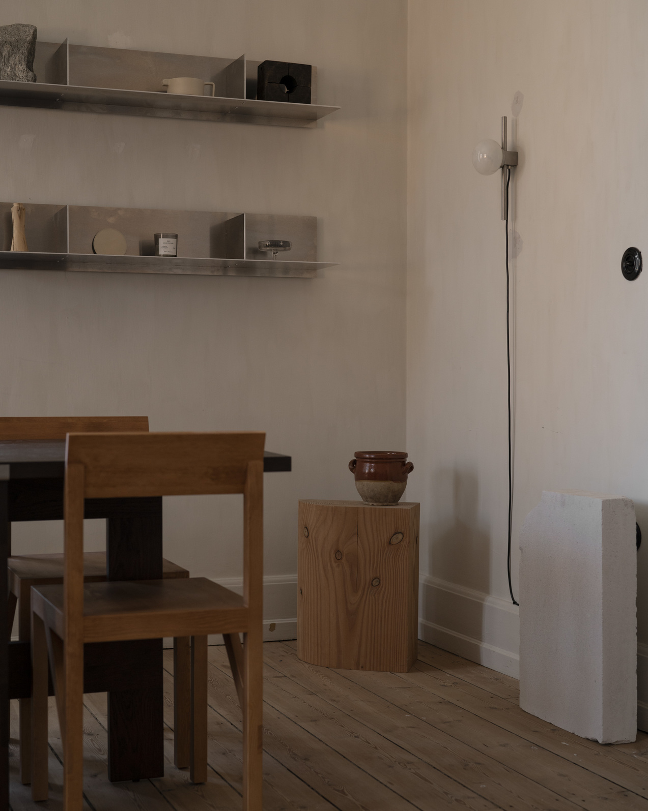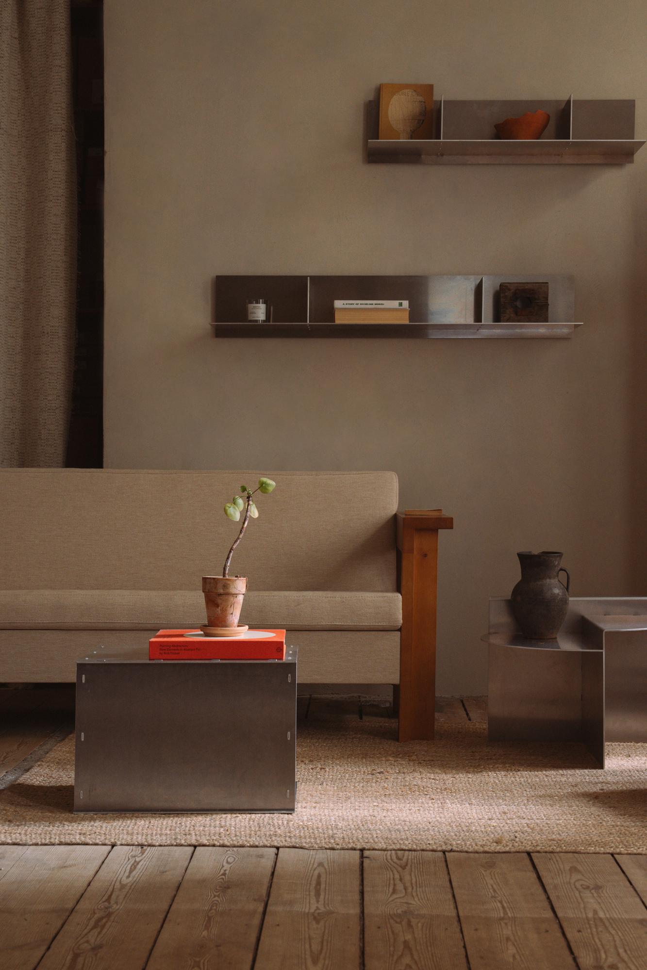 The Rivet Shelf explores basic storing facets within one shape while functioning as a storage and display platform. Based on a riveting technique suitable for making perpendicular joints between separate, laser-cut raw aluminum sheets, the shelf is put together by hand using a hammer in a cold-forming assembly process developed by designer Jonas Trampedach in 2011.