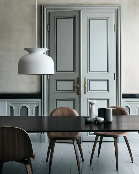 The bell-shaped Ronde Pendant in two sizes has reference to the traditional pendant lamp and the heyday of 1970’s lightning design; however, in a modern interpretation. A unique detail of the Ronde Pendant is the opening on the top with an overhanging collar that reminds of a jar such as a vase or an amphora. The mainly downwards directed light from conventional pendants does in this design also spread out of the spout-like opening and casts a smooth light gradient at the wire and ceiling. The hand-turned aluminium lamp shade with an ultra-matt lacquer almost makes it look as if it was made of ceramics.
