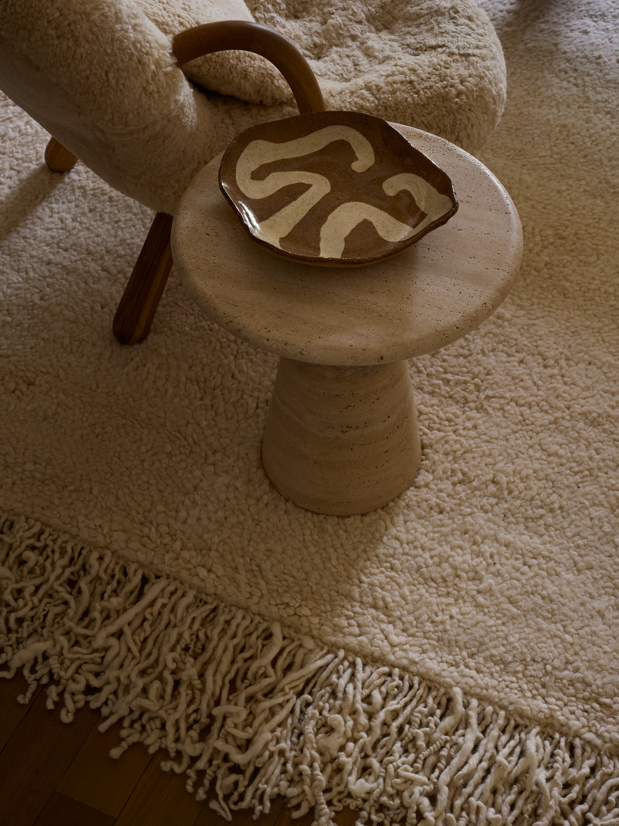 no.10 is an elevated yet classic rug with exaggerated details. The heavy and compact rug in luxury chunky wool is cut in a short pile with bold and curly hand-spun slub yarn that frames the edges and creates a soft vibe to this elegant rug.