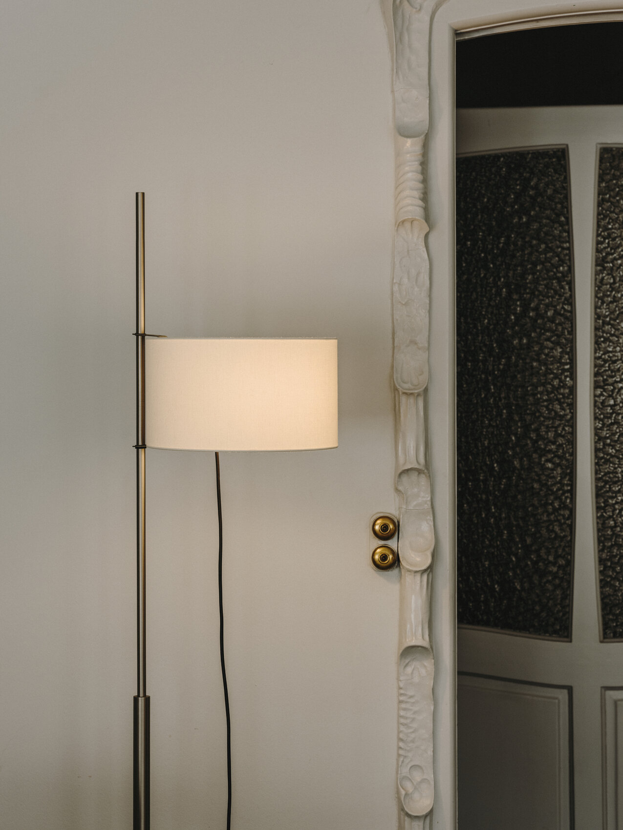 With a structure supported by a circular metal base, the while linen shade of the TMD lamp looks like a sail hoisted on a mast. Whether switched on or off, the TMD manages to add warmth to the space around it. Another example of the timeless sobriety of Miguel Milá.