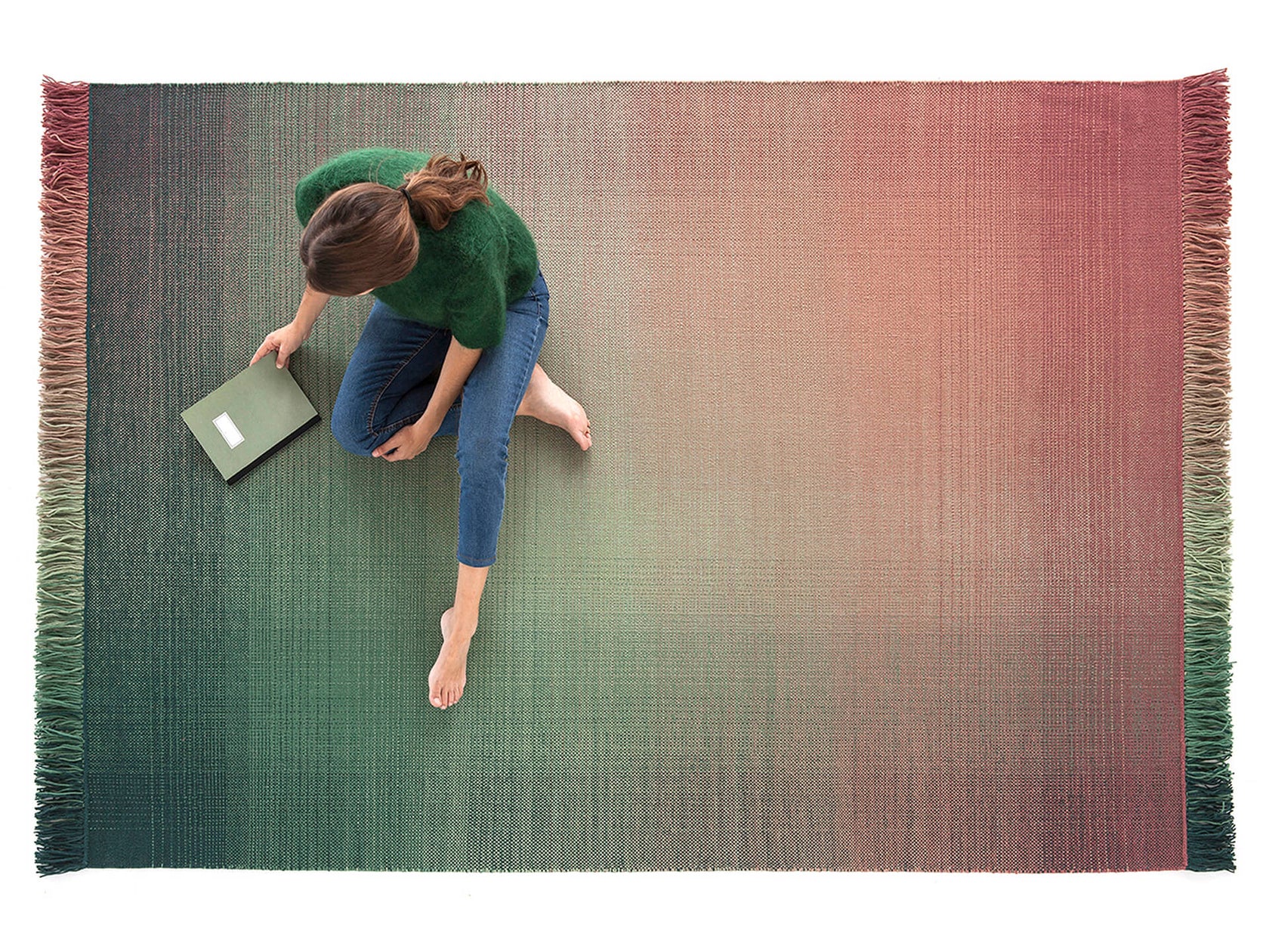 This collection of exquisite simplicity reflects a complex technical process to achieve the density, regularity and fluidity of the desired effect. In each rug, two gradients converge, one vertical and one horizontal, on the same plane, harmonically using six transition tones.Shade is available in four ombré palettes: from turquoise to aubergine, from reddish to Klein blue, from raspberry to forest green and from gray to maroon brown.