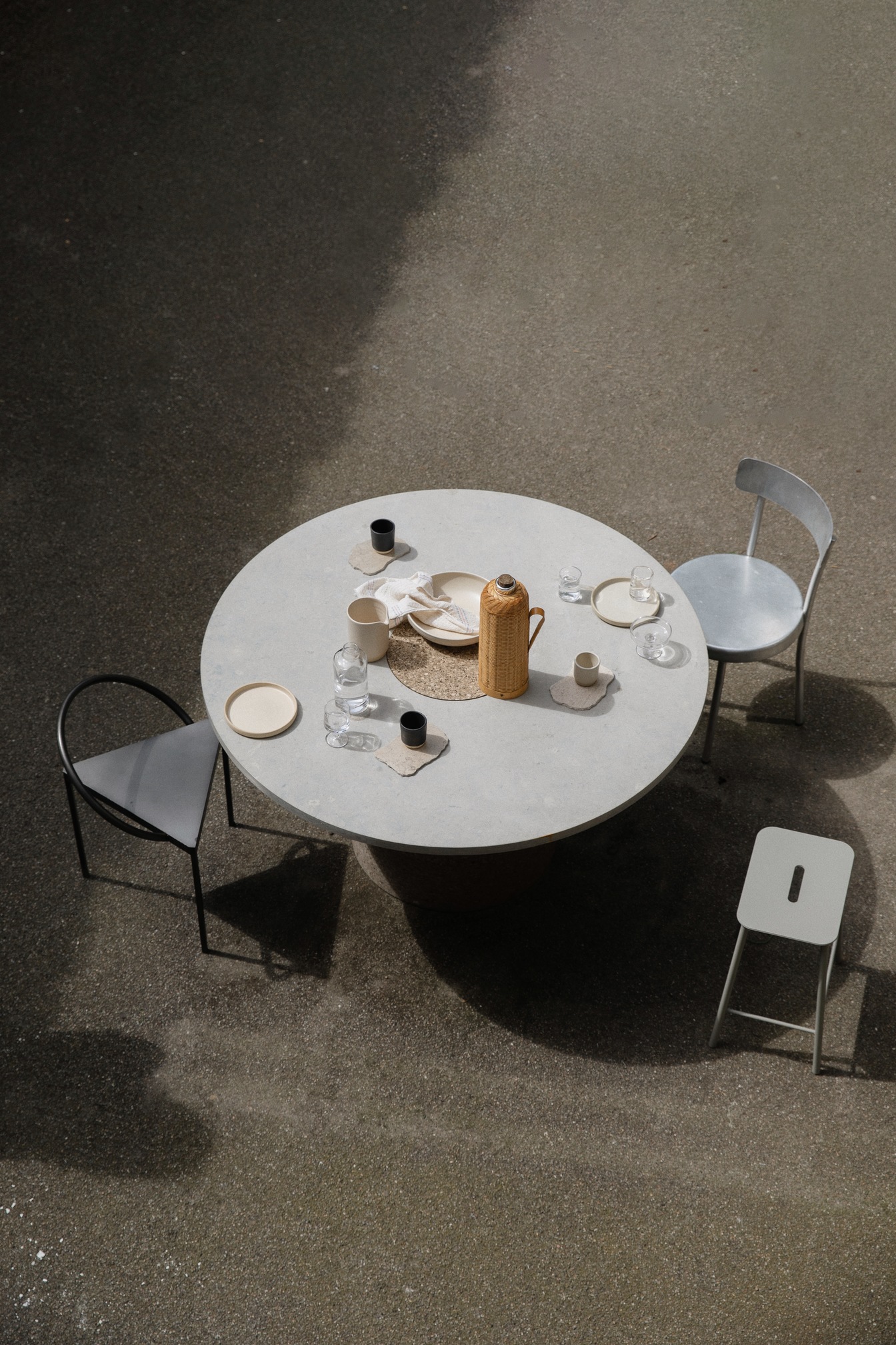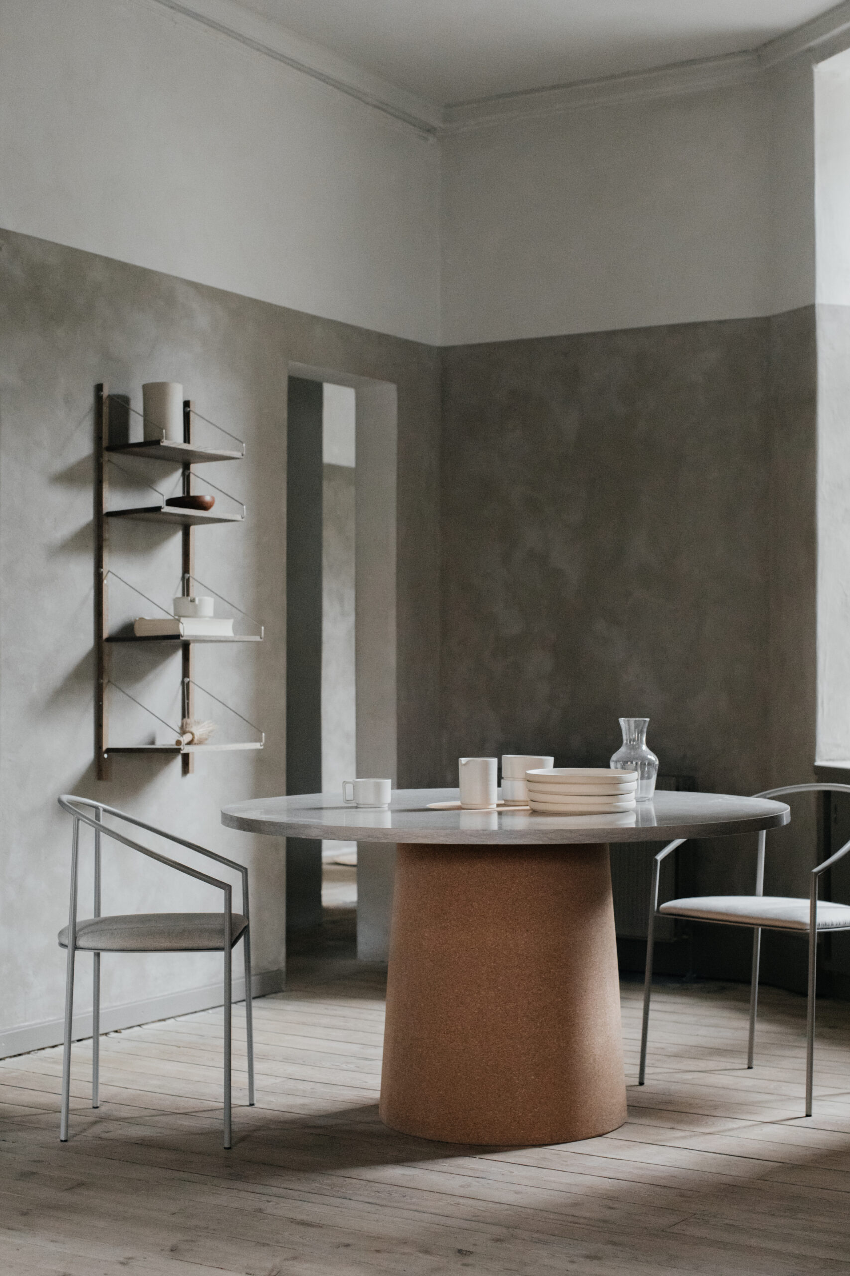 Suitable as a dining table or meeting table, the Sintra Dining features a smooth marble top with a contrasting rounded cork base.