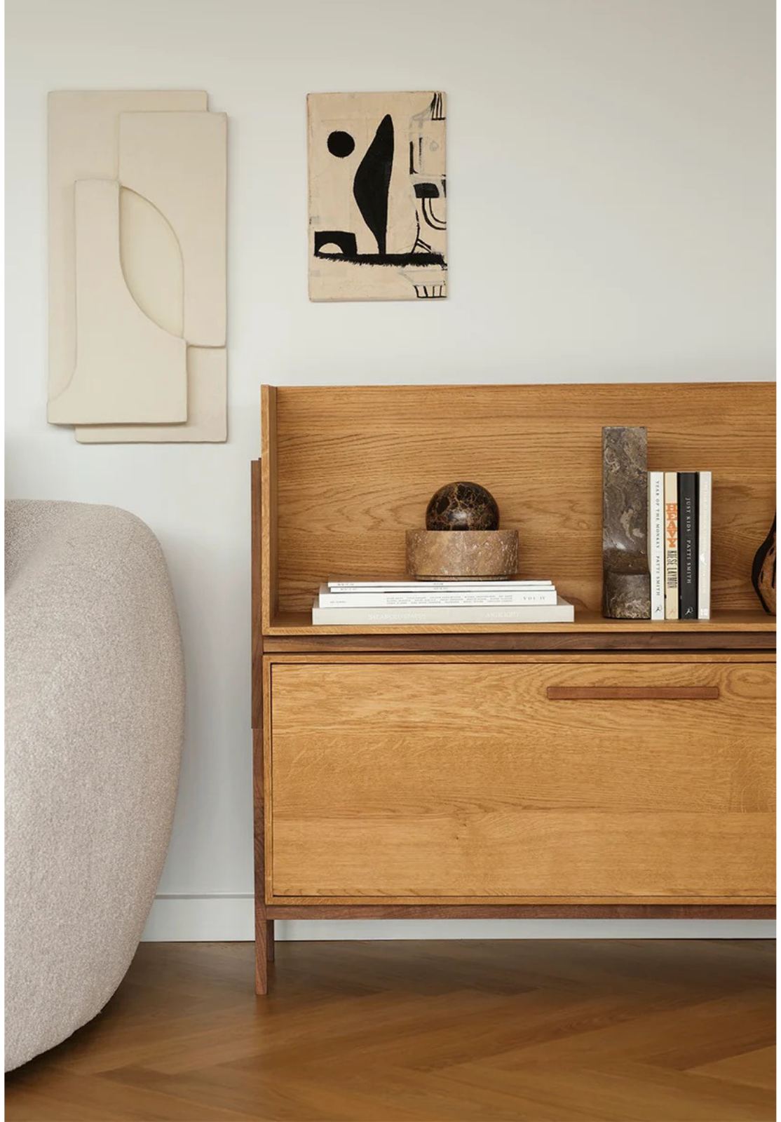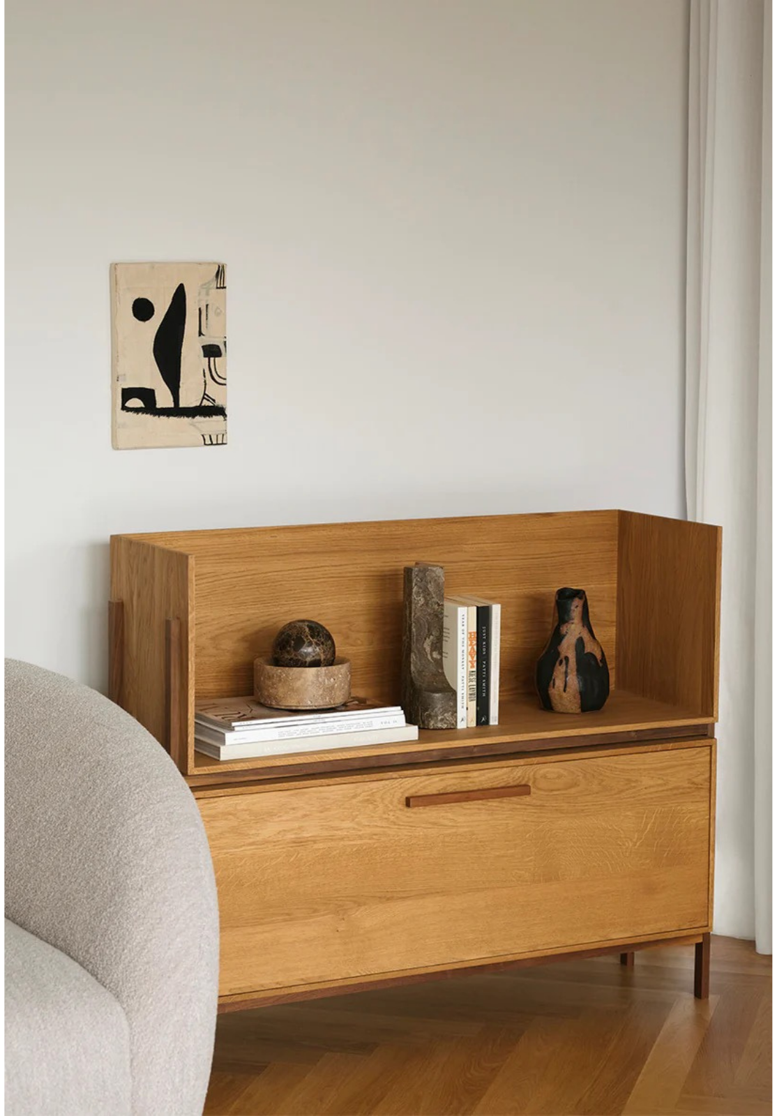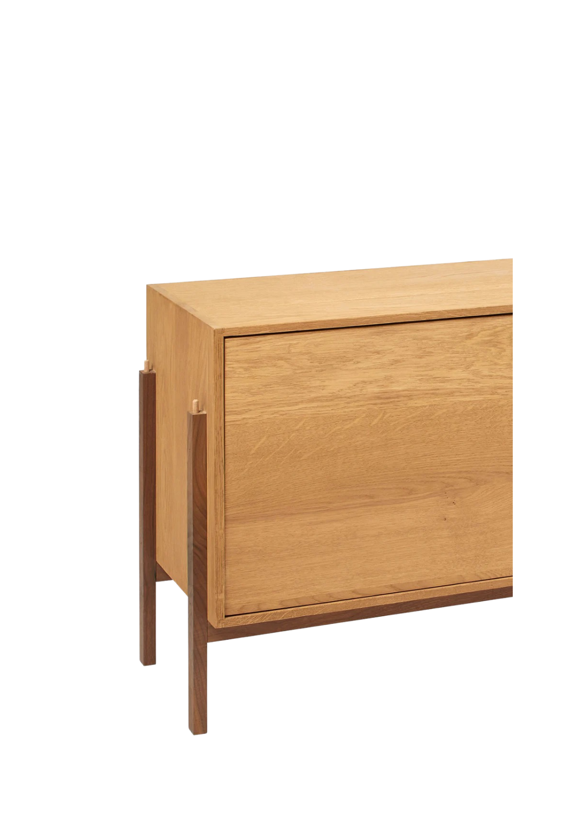 Crafted from solid oak with walnut legs, the Stack Cabinet Mid/Bottom is a closed storage unit designed as an extension of the Stack series. The closed front maintains a clean and reduced expression, consistent with the overall language of the system. Designed to be placed beneath the Stack Cabinet Top, the unit allows the storage composition to expand vertically. A balanced modular component shaped by material warmth, form and order.