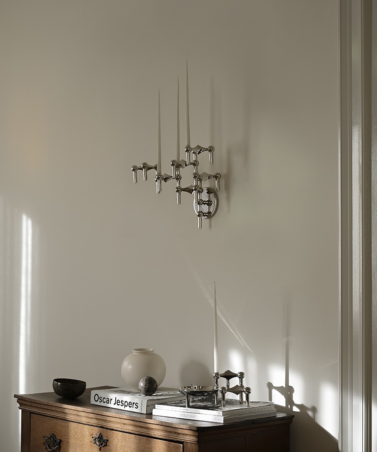 The wall hanger has been carefully developed to expand the visual possibilities of the candle holder. Inspired by the iconic STOFF Nagel design the wall hanger makes it possible to create unique sculptures from vertical surfaces with infinite pieces of the candle holder, bowl, and vase. The wall hanger is understated and discreet encouraging the exploration of individual ways to exhibit your STOFF Nagel collection.