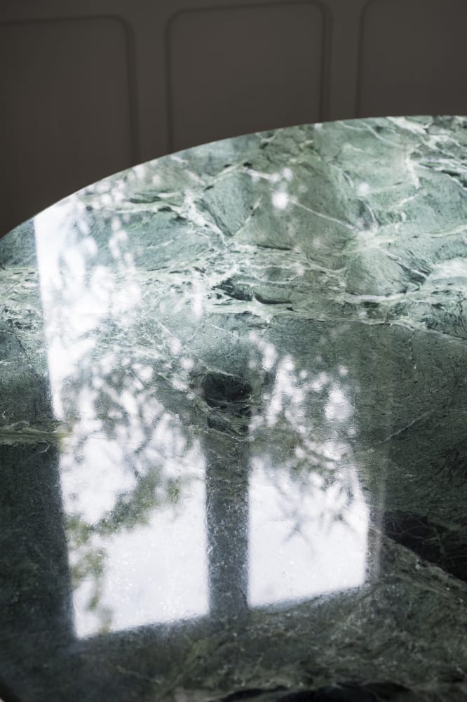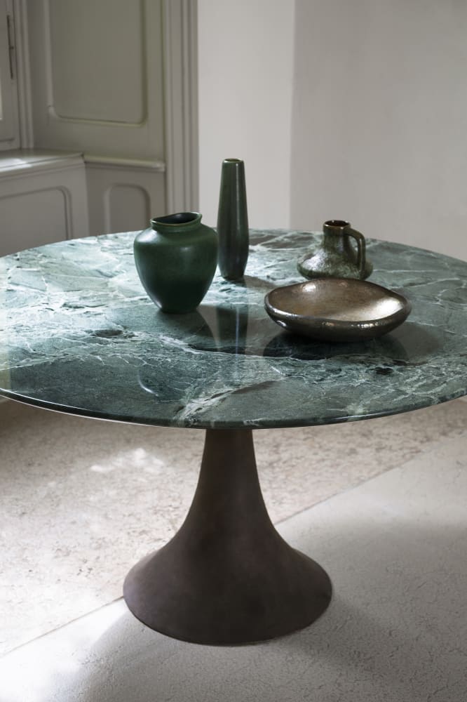 Round table with bronze base and marble top with polished finish. The central support is made of cast bronze with a lost-wax mould, surface treated with a patina of heat-applied silver nitrate. Given the artistic value of the workmanship, the bronze base has a limited production of only 100 signed and numbered pieces.