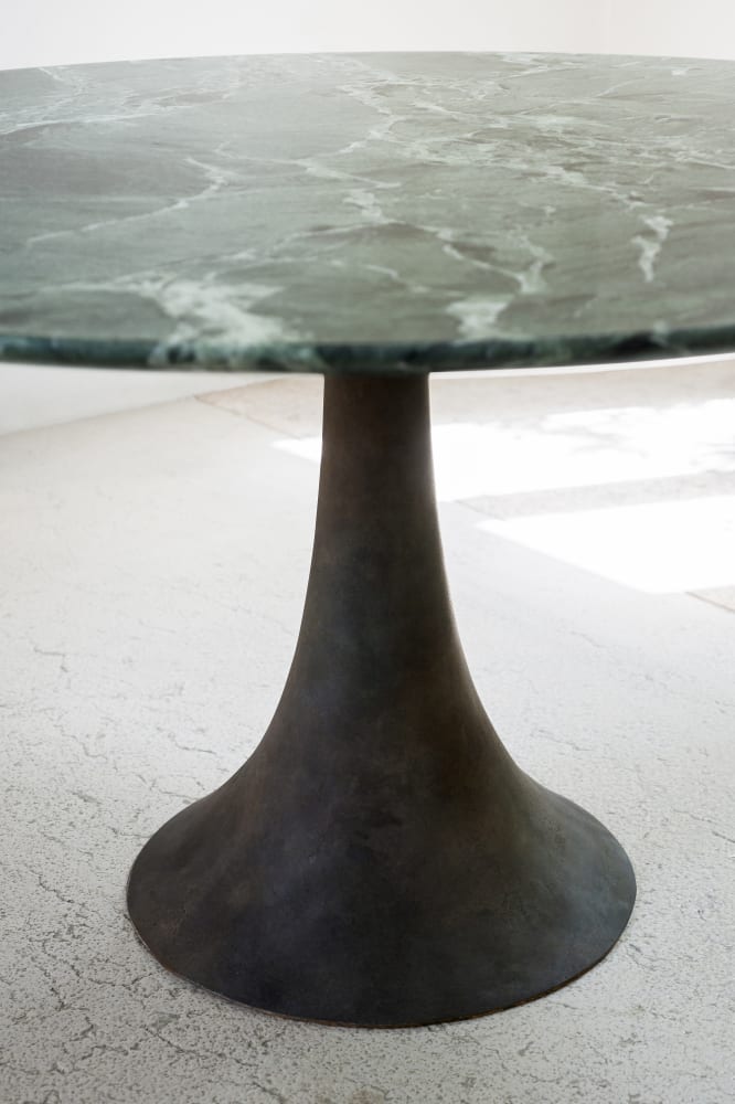 While at work on mass-producible, prefabricated, cast-concrete elements for architecture, with amusing wit, Mangiarotti opts for the ancient technique of lost-wax casting for his first table in bronze. Mainly used in the production of sculptures, this particular technique makes each multiple unique as the mould itself needs to be destroyed to extract the cast item. The process, the geometry, the weight and its resistance allow the conical bronze base of SK207 to support large tabletops in marble for an exquisite combination of materials, surfaces and textures.