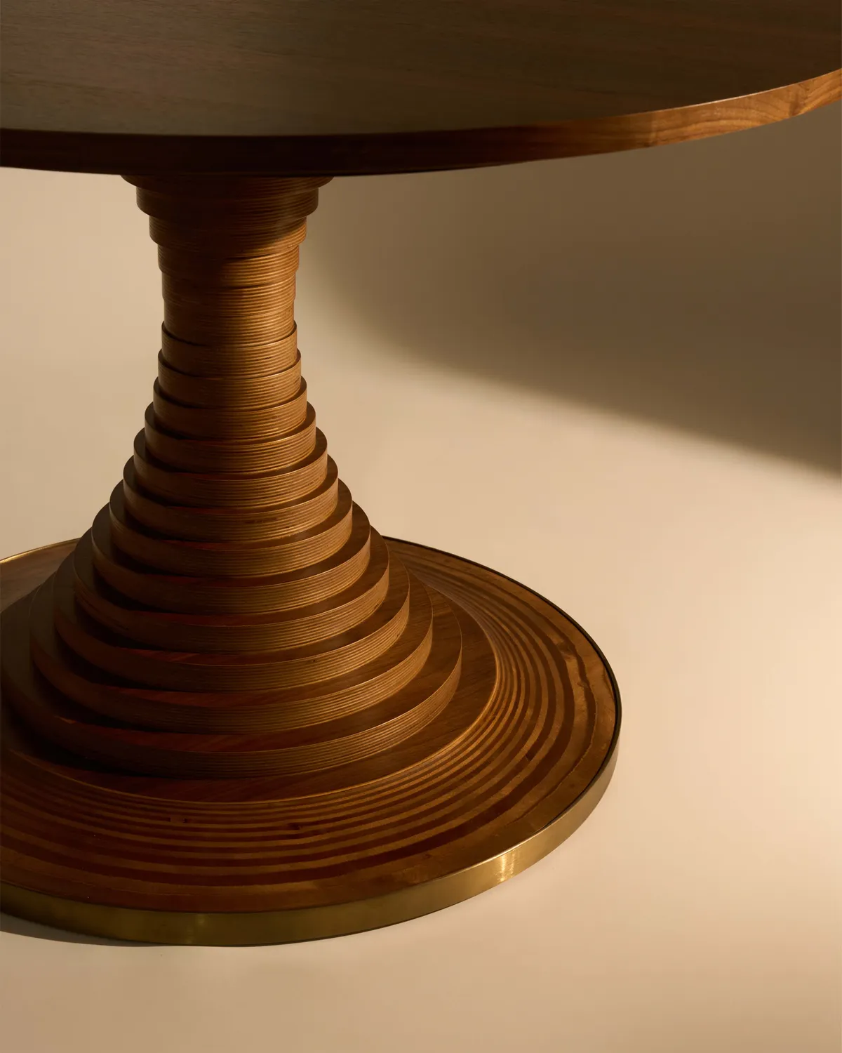 Designed in 1963 by the influential Italian architect Carlo De Carli, the Tavolo a Dischi dining table is an elegant marriage of function and form, combining structural innovation, expressive materiality, and practical excellence. The round table is ingeniously constructed from 3cm-thick FSC® Mix-certified birch plywood discs of varying diameters and from other responsible sources (FSC® C176589), stacked around a concealed metal core, to form an elegant curve that supports a generous tabletop in walnut veneer, now available in two sizes. A burnished brass-toned steel band at the base adds material contrast while providing protection. Equally suited to dining, meetings, or gatherings, the Tavolo a Dischi is a centerpiece that brings people together, fostering connection and conversation.