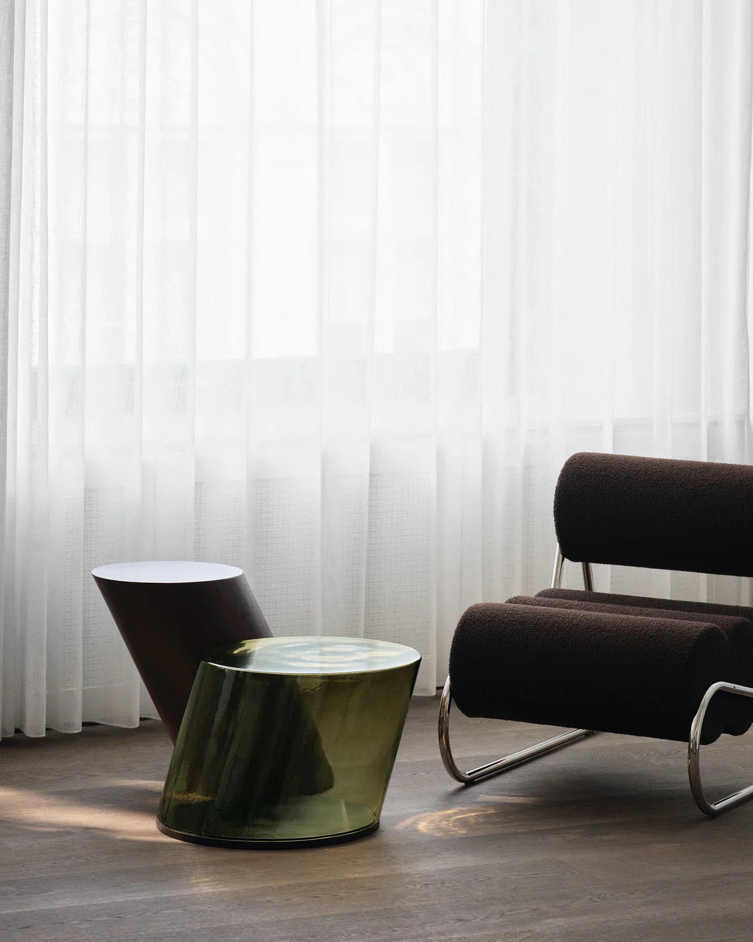 The Tilt table plays with the illusion of balance, making it look as though it’s on the verge of tipping over. With its clean, geometric design, Tilt draws strong inspiration from the bold aesthetics of the 1980s. Considerable effort was invested in finding the right weight and balance point to ensure that the table stands as stable as any traditional piece, despite its unconventional form.