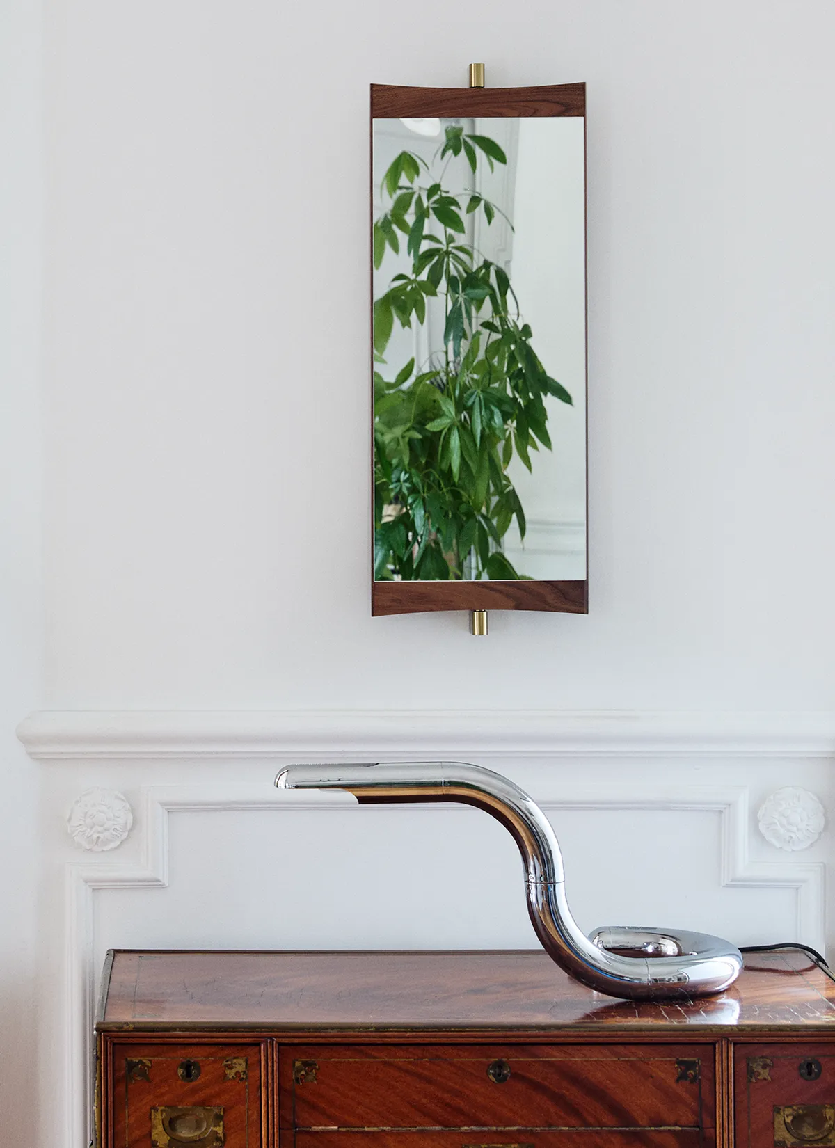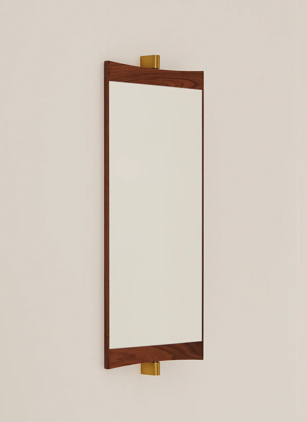 A contemporary echo of the 18th-century vanity-table mirror that gives it its name, the Vanity Mirror Collection is GamFratesi’s second wall-mounted mirror design for GUBI. The collection comprises three variations – with one, two and three mirror panels, respectively. The design’s defining features are its warm walnut veneer and brass hinges. These allow the angle of the mirror to be adjusted, influencing the perspective it offers and the play of the light in the room. On the single-panel Vanity Mirror 1, the hinges permit a 15o rotation, whereas the 180o hinges on the Vanity Mirror 2 and Vanity Mirror 3 allow the panels to fold flat on top of one another, covering the mirror when not in use.