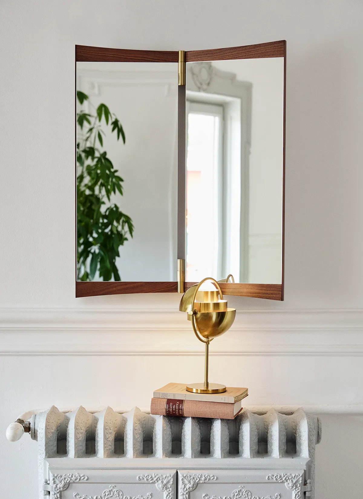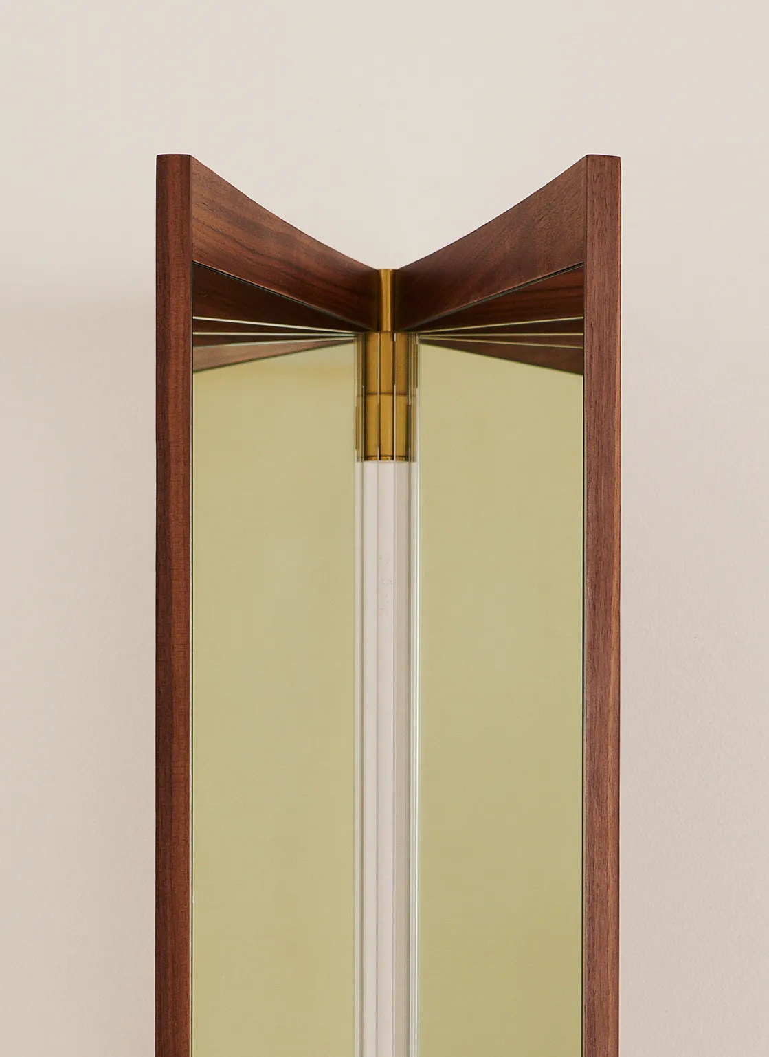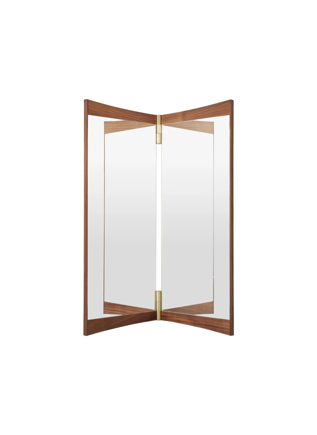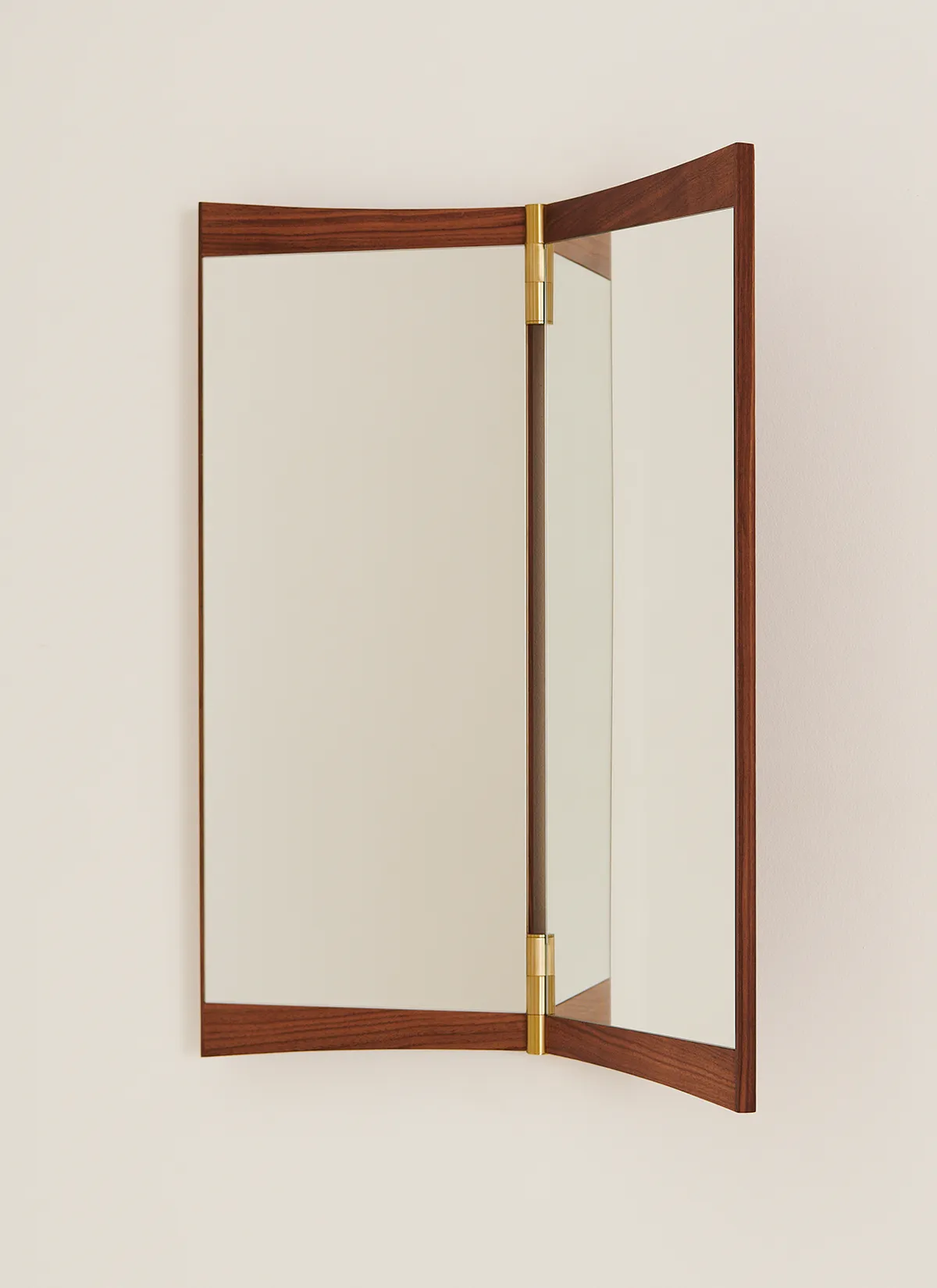 A contemporary echo of the 18th-century vanity-table mirror that gives it its name, the Vanity Mirror Collection is GamFratesi’s second wall-mounted mirror design for GUBI. The collection comprises three variations – with one, two and three mirror panels, respectively. The design’s defining features are its warm walnut veneer and brass hinges. These allow the angle of the mirror to be adjusted, influencing the perspective it offers and the play of the light in the room. On the single-panel Vanity Mirror 1, the hinges permit a 15o rotation, whereas the 180o hinges on the Vanity Mirror 2 and Vanity Mirror 3 allow the panels to fold flat on top of one another, covering the mirror when not in use.